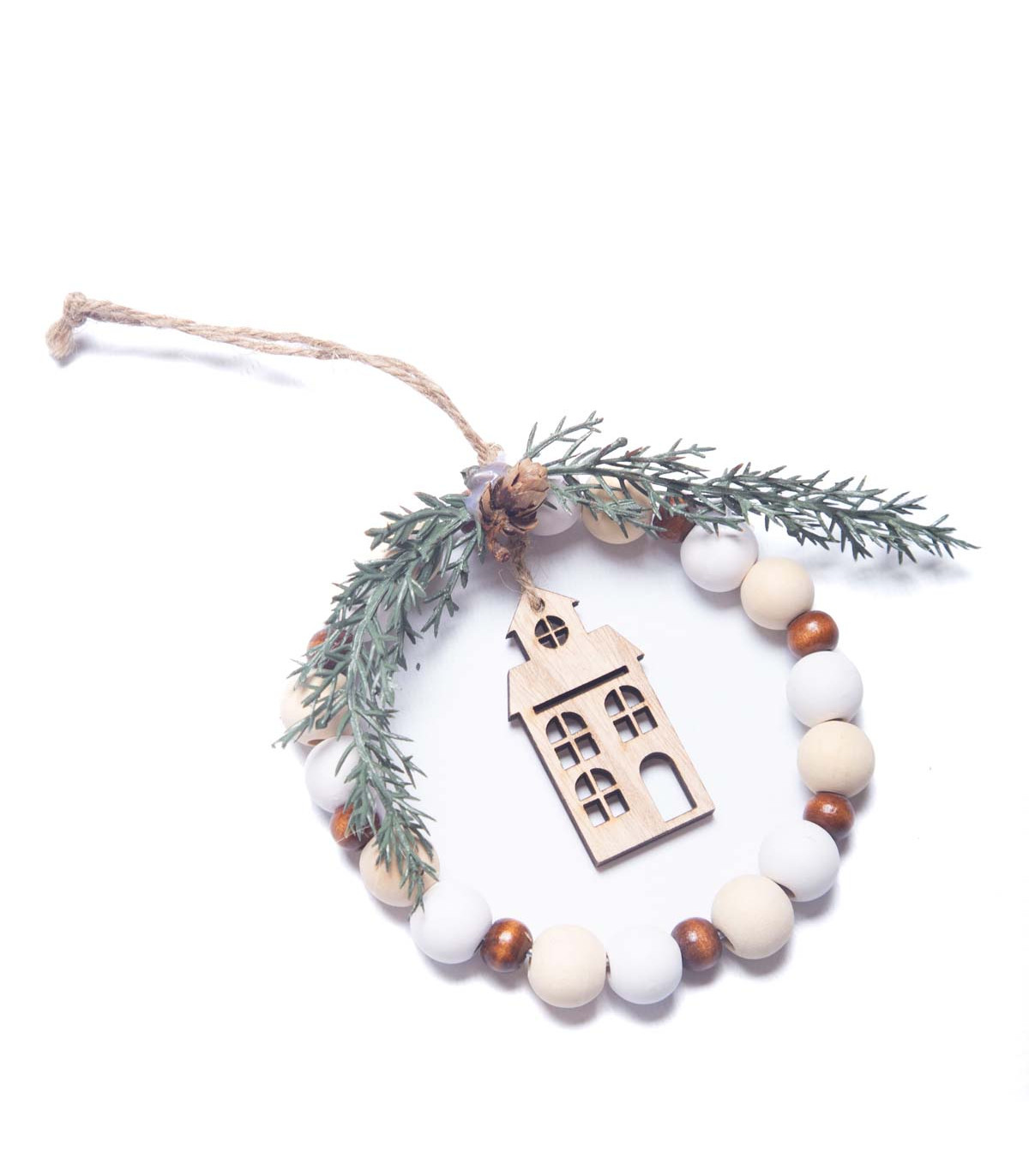 Un adorno navideño colgante de 13.5 cm de alto con 8 formas: búho, anillo cascabel, sueter, árbol de fieltro, árbol de lana, casa con cuentas de madera, retrato de Santa, árbol y reno con LED. Colores: gama marrón y...