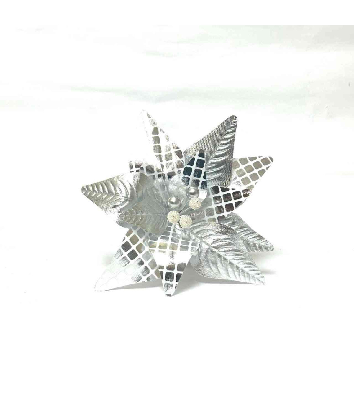 Un adorno con forma de flor de Estrella Federal calada de 15 cm de diámetro hecho en tela poliéster, platico y alambre para decorar el árbol de Navidad.