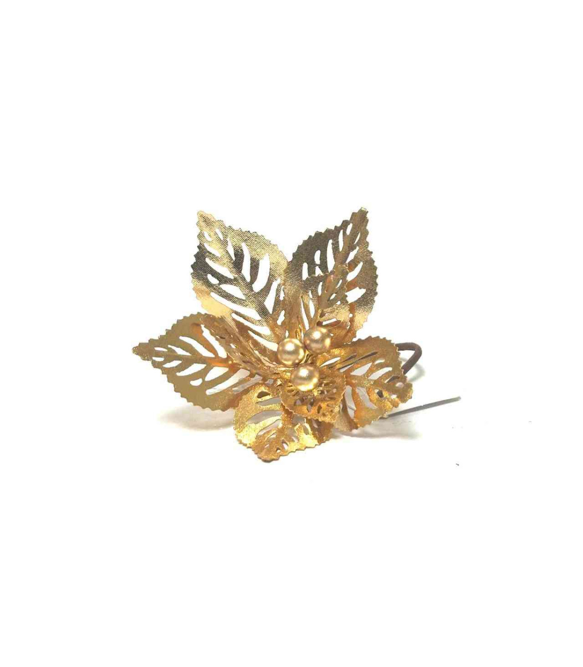 Un adorno con forma de flor de 10 cm de diámetro hecho en tela poliéster, goma espuma, plástico y alambre para decorar el árbol de Navidad.