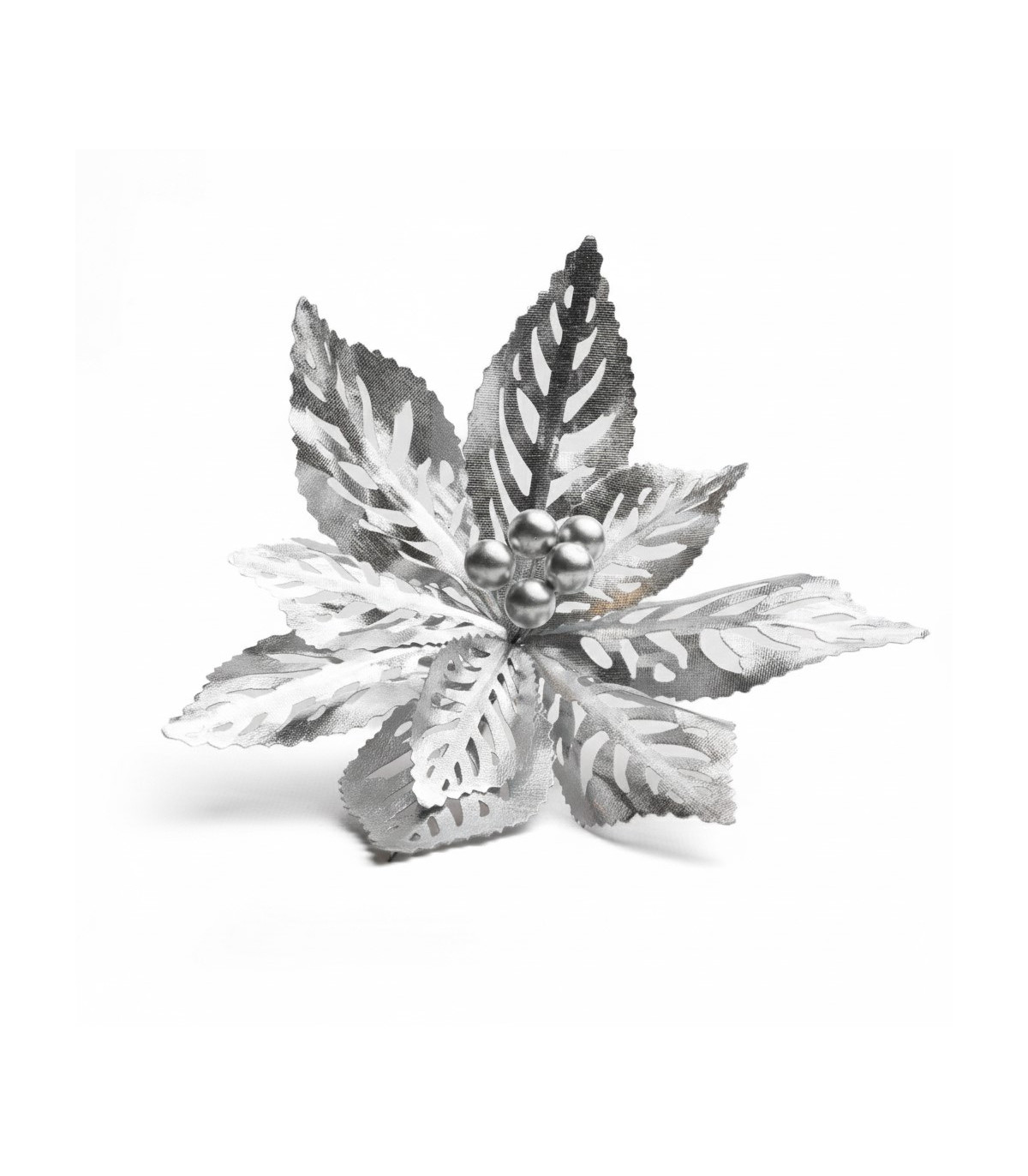 Un adorno con forma de flor de Estrella Federal calada de 15 cm de diámetro hecho en tela poliéster, platico y alambre para decorar el árbol de Navidad.