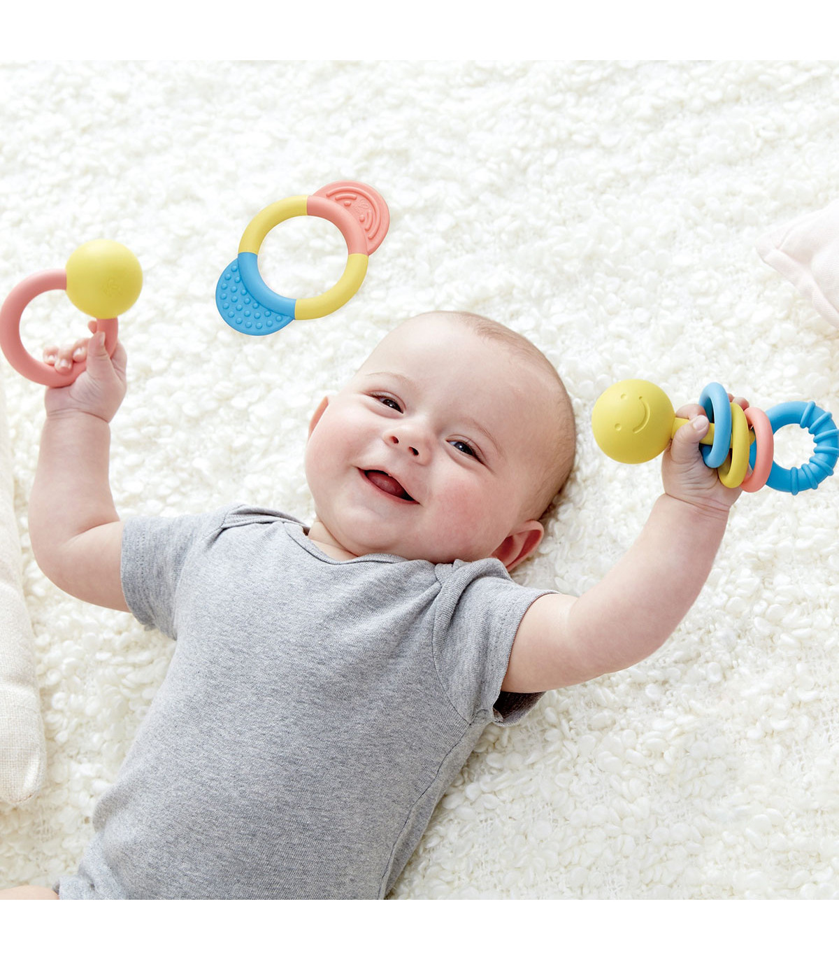 Fabricado con materiales seguros a base de arroz, esta colección de 3 juguetes sensoriales ayuda a los bebés a dar sus primeros pasos en la experimentación. Diseñados para ser sujetados por dedos pequeños.