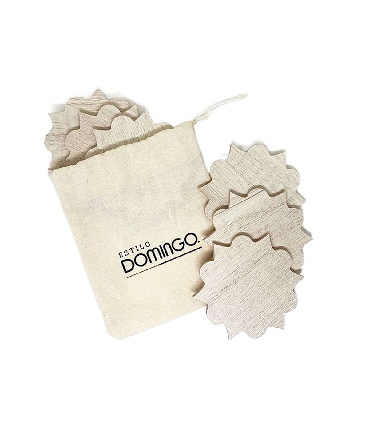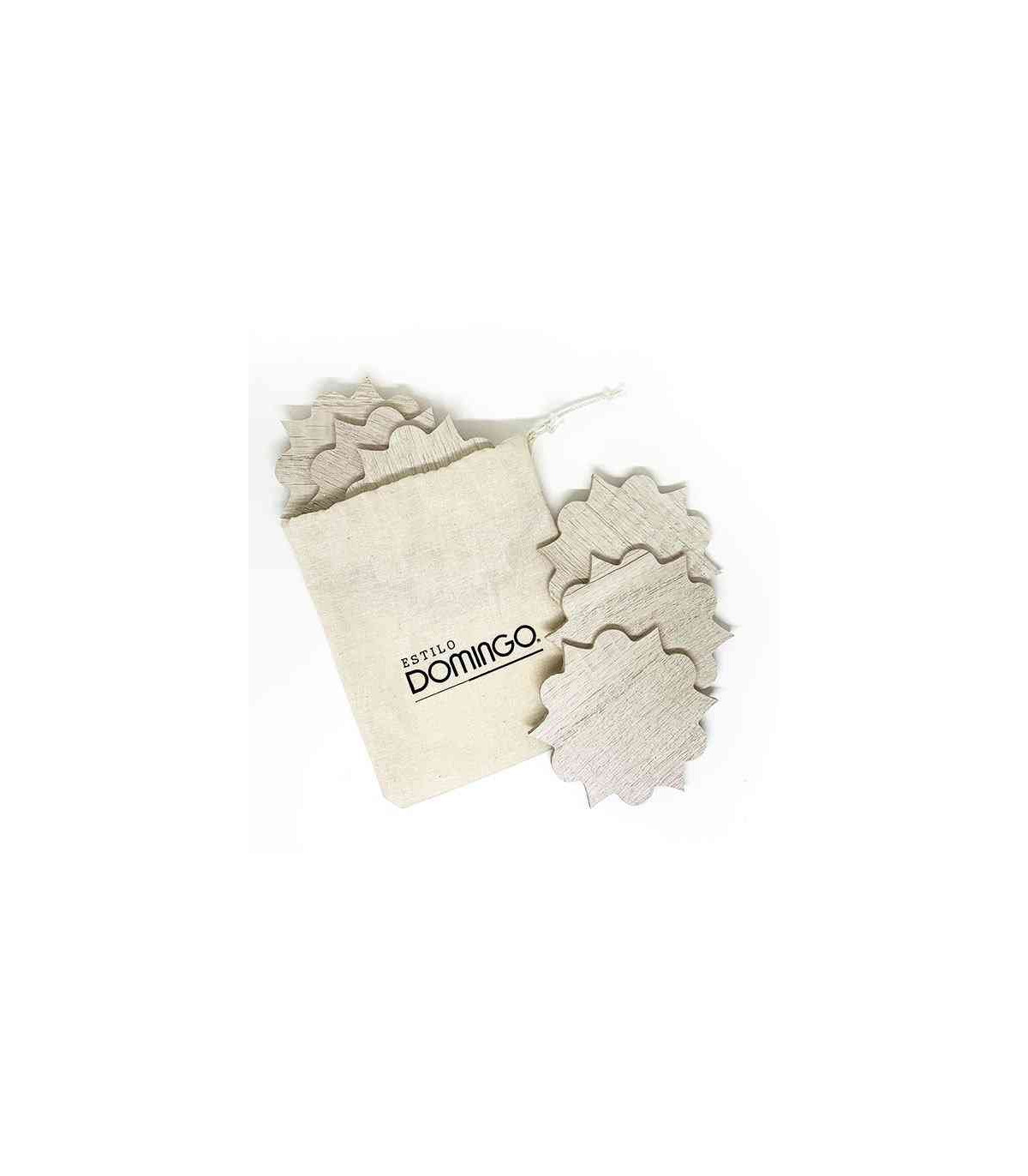 6 posavasos en caja de cartulina con forma de mandalas de madera de 11 cm de diámetro y 6 mm de espesor, con una cara de melamina. Color Helsinki. Hechos en madera recuperada de los sobrantes de muebles hechos a medida.