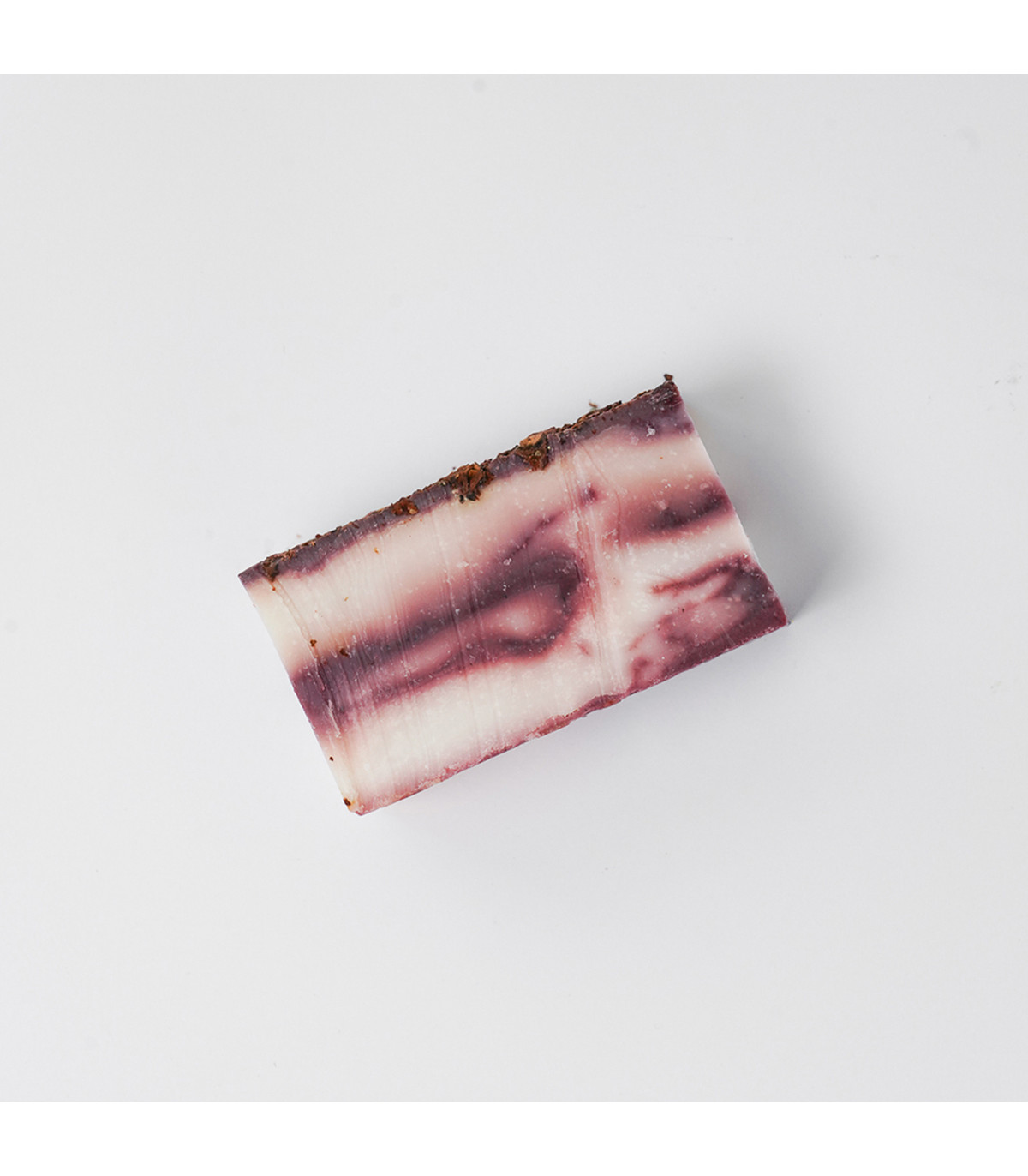 Jabón 100% natural de 115 g hecho con una base de carbón cosmético con un dulce aroma a flores de violetas silvestres y está indicado para todo tipo de piel. El juego de colores es parecido al de una nebulosa.