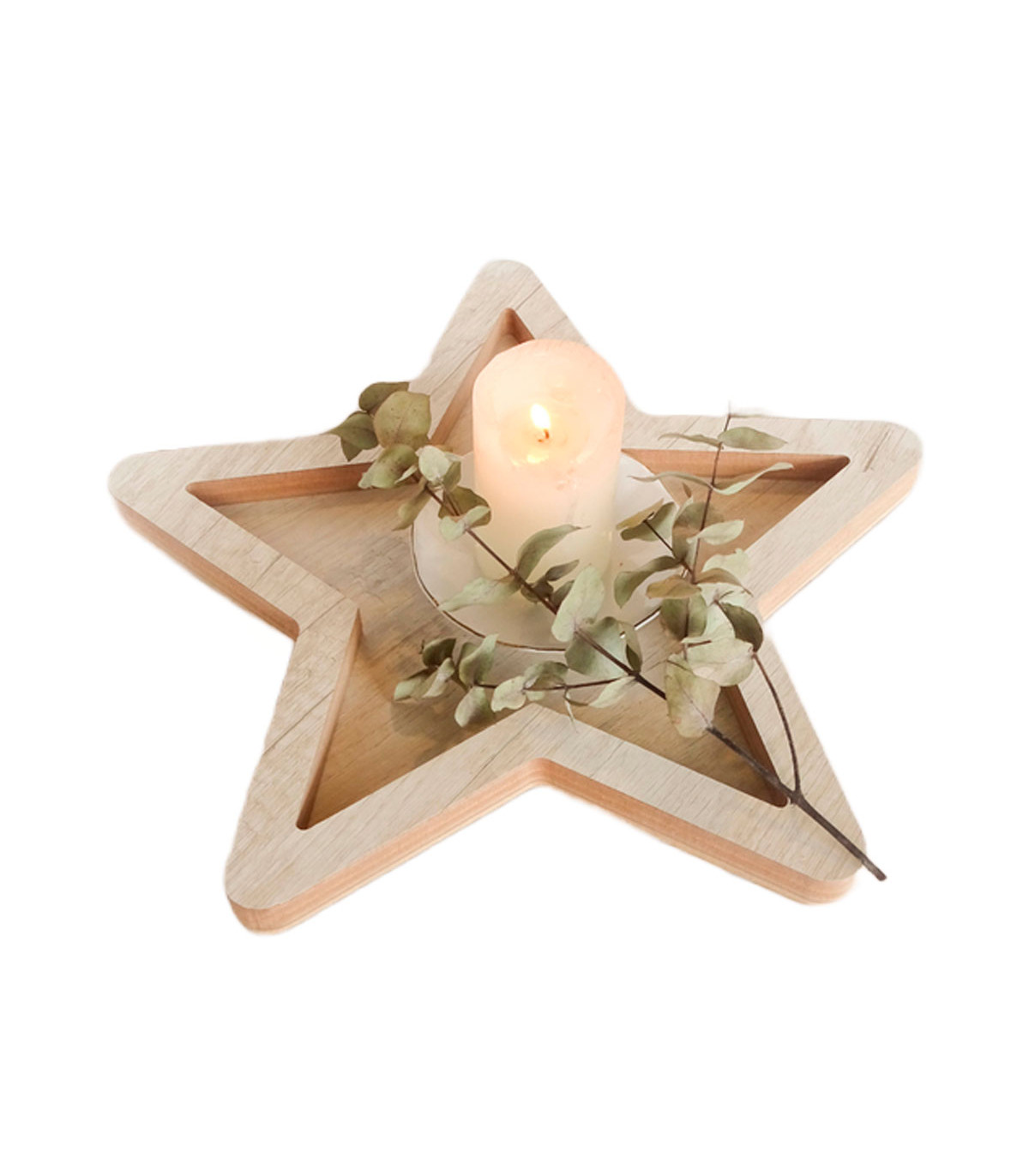 Una bandeja en forma de estrella de madera de 35 cm de diámetro y bordes de 2 cm de alto. Hecha en madera recuperada de los sobrantes de muebles hechos a medida.