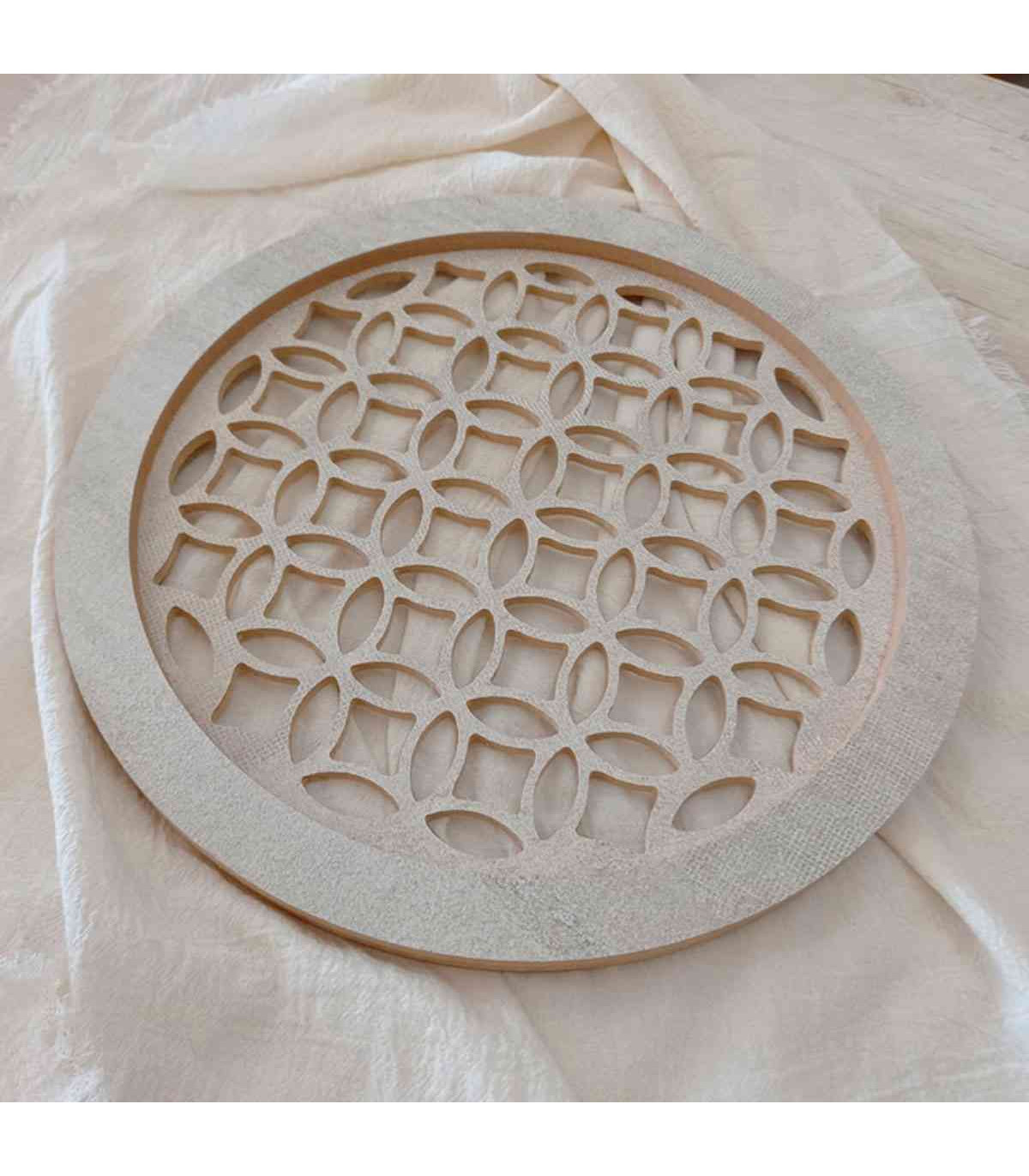 Una bandeja circular de madera con fondo calado de 35 cm de diámetro y bordes de 2 cm de alto. Color Viena (beige). Hecha en madera recuperada de los sobrantes de muebles hechos a medida.