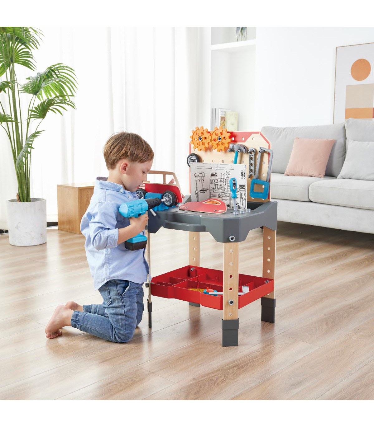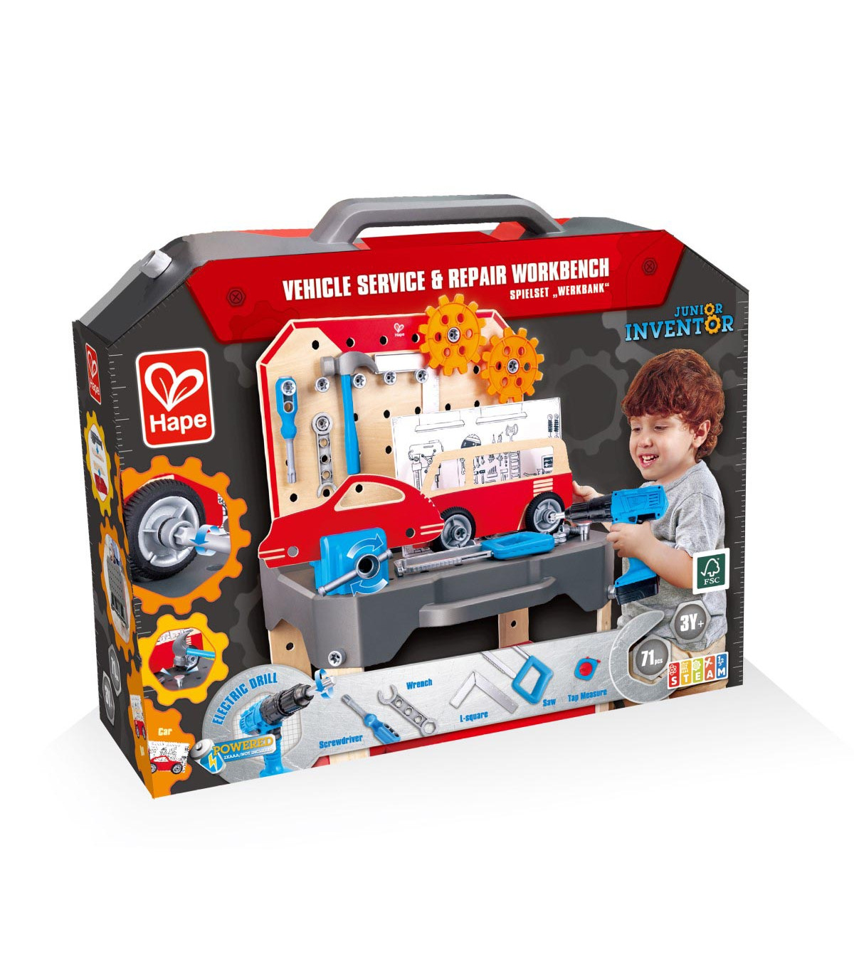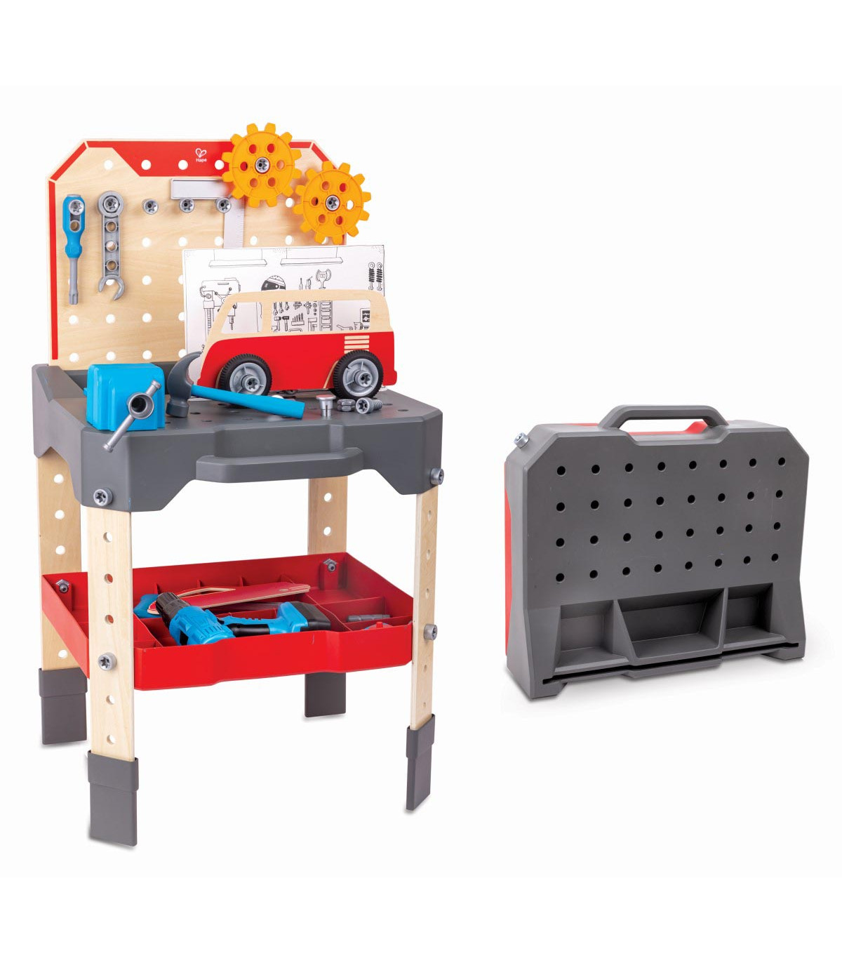 El sueño de todos los pequeños mecánicos, su propio banco de trabajo con fantásticos accesorios. Contiene muchas herramientas útiles que se pueden guardar y almacenar de forma muy práctica en el banco de trabajo.
