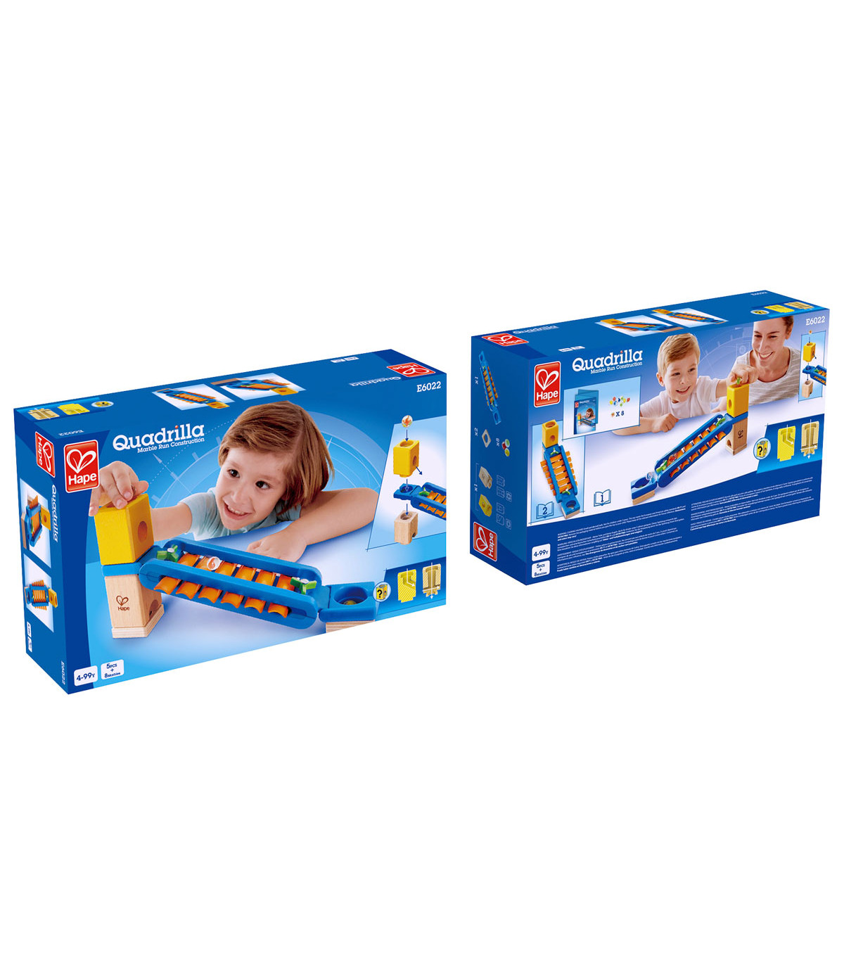 Añadile dimensión sonora a tus laberintos de bolitas Quadrilla de 13 piezas con un riel xilófono que toca una escala musical cuando las bolitas pasan sobre él.