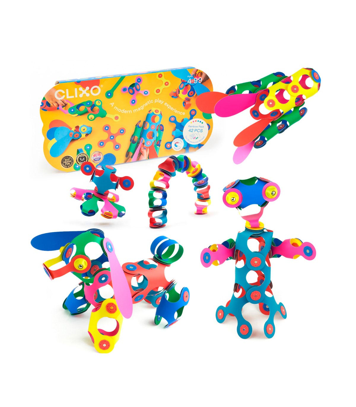 Mejorá tu juego Clixo con el pack perfecto para dar rienda suelta a tu imaginación. Un arcoíris de posibilidades con 42 piezas en 8 formas únicas de Clixo, incluyendo 3 spinners. Hacé creaciones colgantes, curvas o para que las lleves puestas.