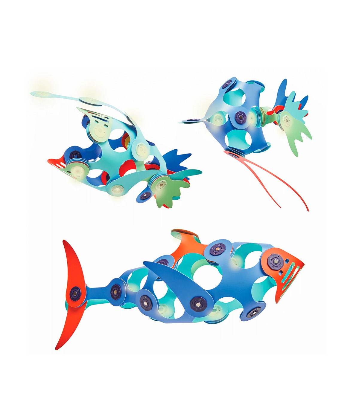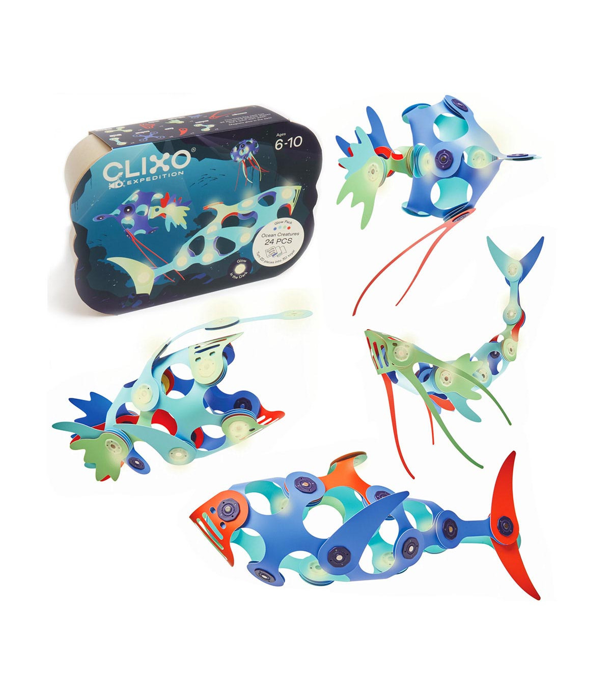 Las piezas, aletas y tentáculos que brillan en la oscuridad dan vida a las maravillas submarinas. Inspira confianza creativa, fomenta el aprendizaje STEAM y crea infinitas creaciones submarinas. Contiene 24 piezas en 9 formas únicas de Clixo.