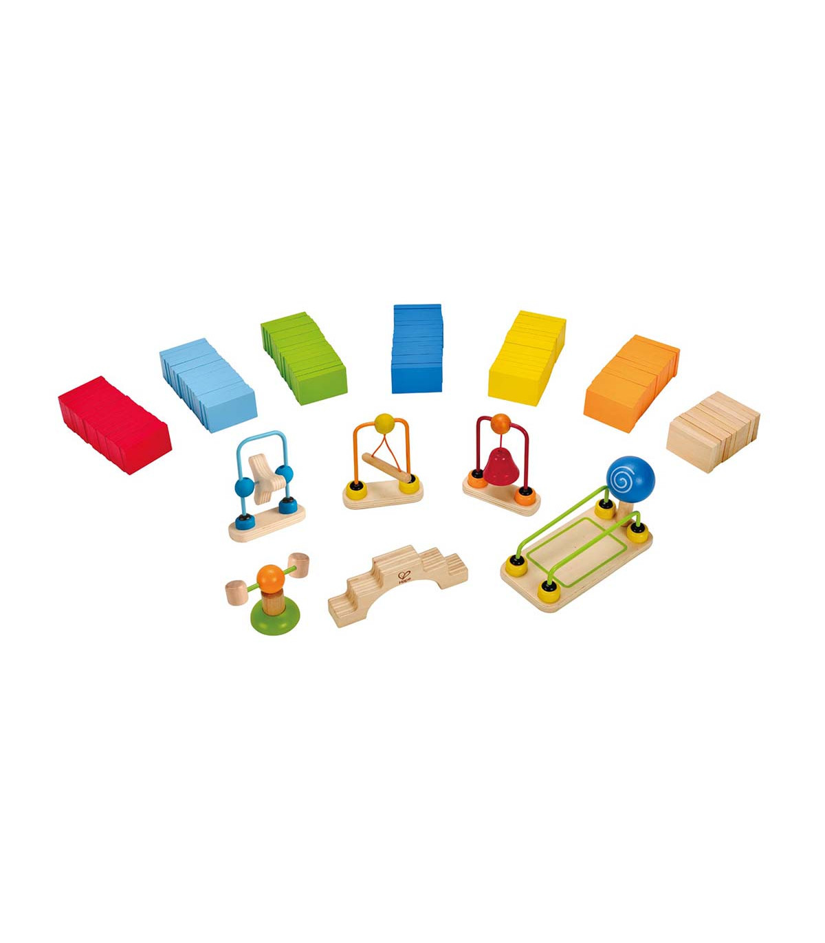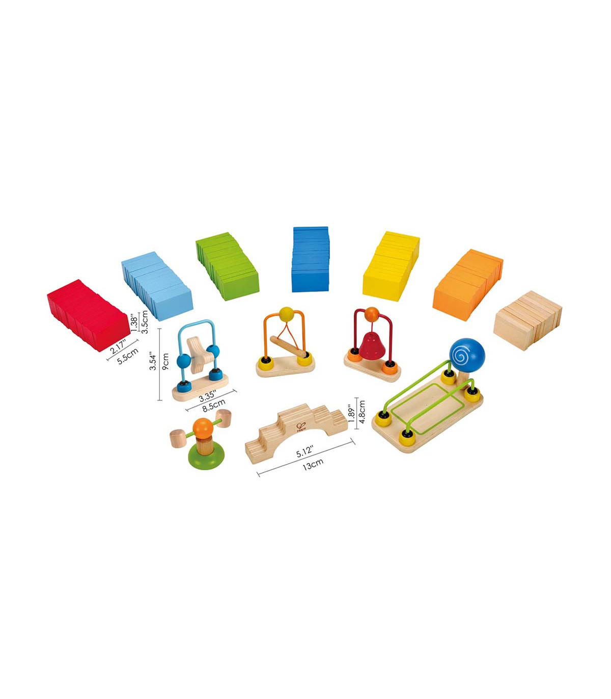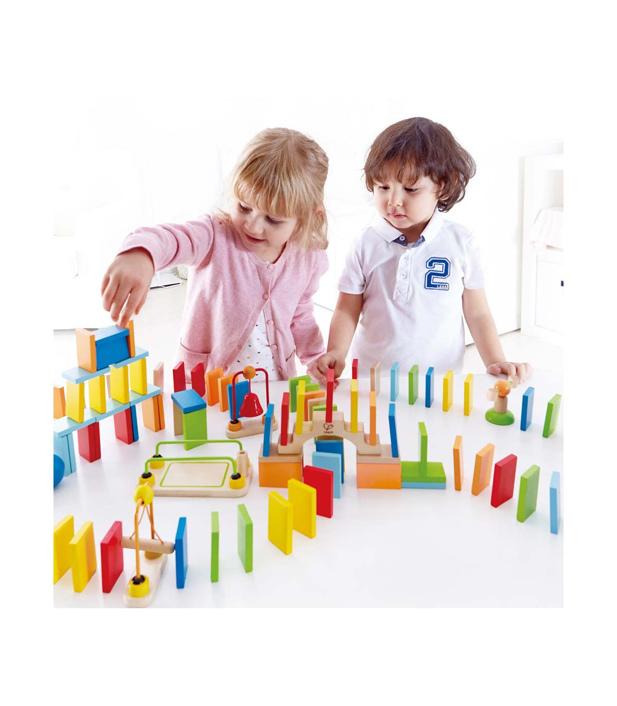 Construí una fila de 100 coloridos dominós de madera. Poné un puente, campanas, rieles y otros accesorios. Da un golpecito a uno de los rectángulos y vas a ver cómo caen todos, uno detrás del otro.