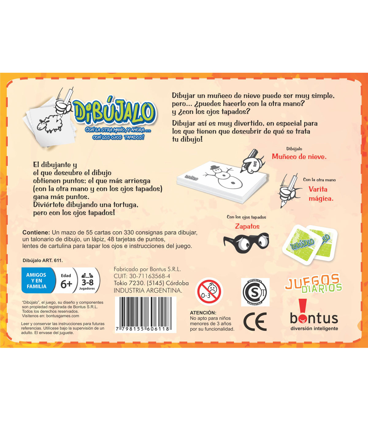 El dibujante y el que descubre el dibujo ganan puntos. Dibujá una tortuga con los ojos tapados. Dibujá un muñeco de nieve con la otra mano. Es muy divertido, en especial para los que tienen que descubrir de qué se trata. Edad: a partir de 6 años.