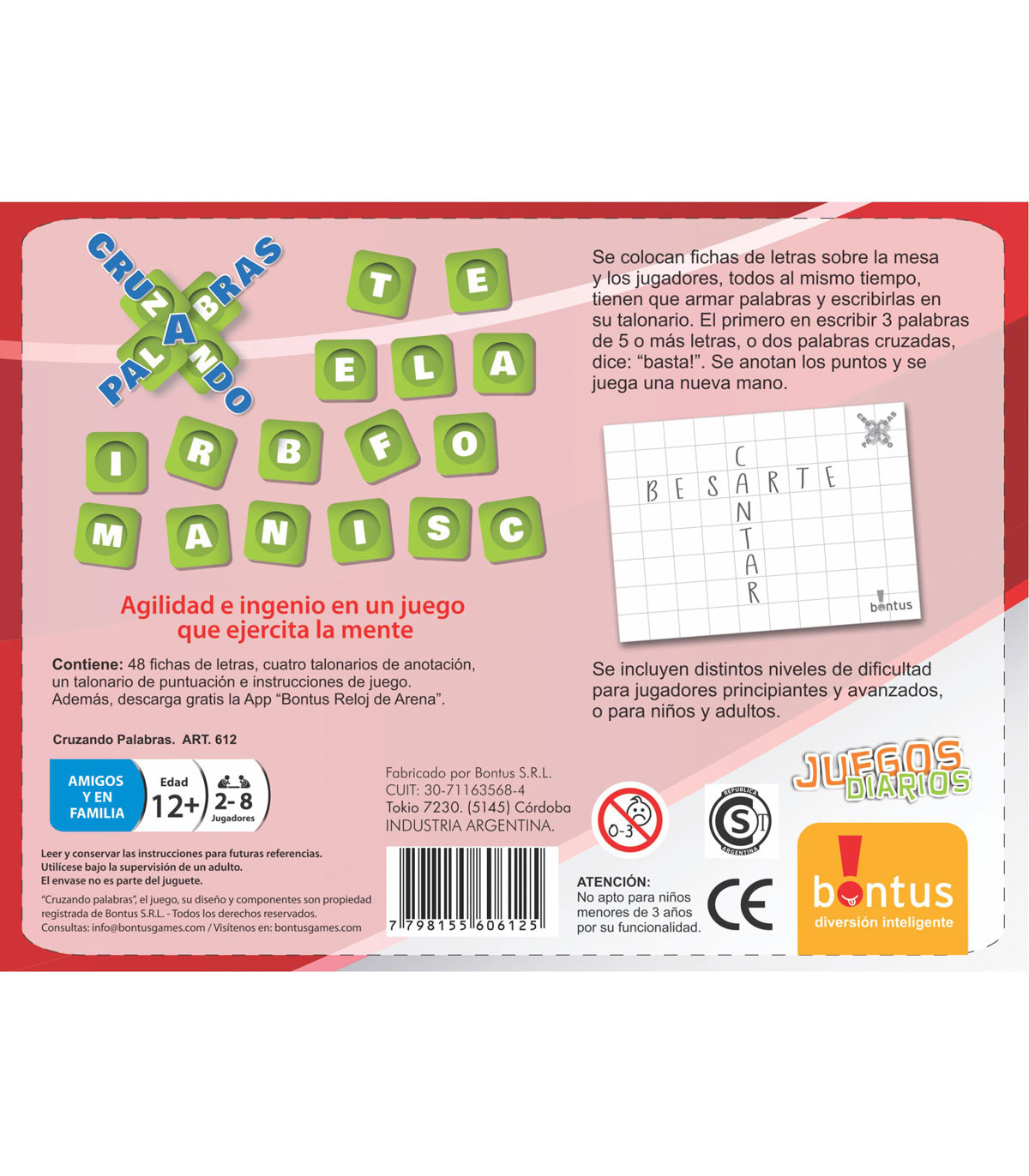 Con las letras sobre la mesa, todos al mismo tiempo tienen que armar palabras. El primero en escribir 3 palabras de 5 o más letras o dos palabras cruzadas dice Basta. Agilidad e ingenio en un juego que ejercita la mente. Edad: a partir de 12 años.