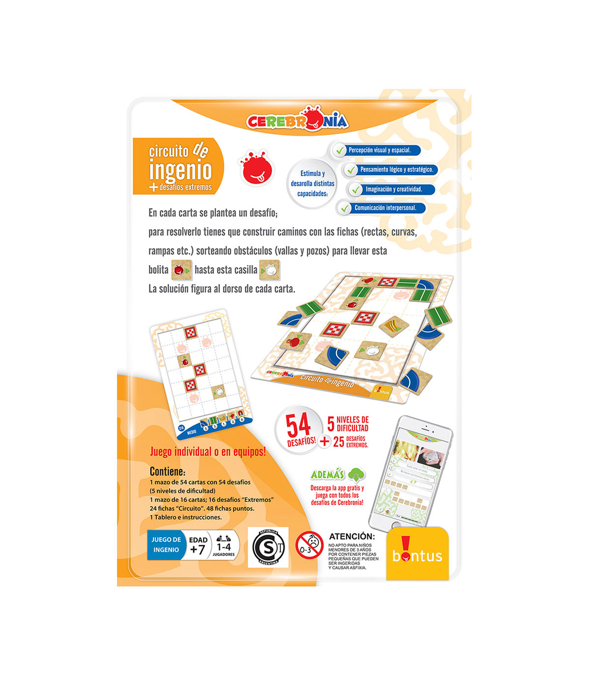 Resolvé cada desafío construyendo caminos con las fichas y sorteando obstáculos para llevar la bolita a destino. 54 desafíos y 25 desafíos extremos. Además, descargá la app y jugá con todos los desafíos de Cerebronia. Edad: a partir de 6 años.