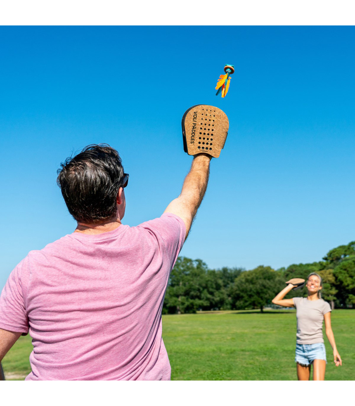 Redefiní tus juegos de paleta con VOLI. Acción y diversión en la playa, parque o camping. Paletas de corcho que se ajustan como guantes y golpean como raquetas. Incluye 2 paletas y 1 Flyer. Edad: +8