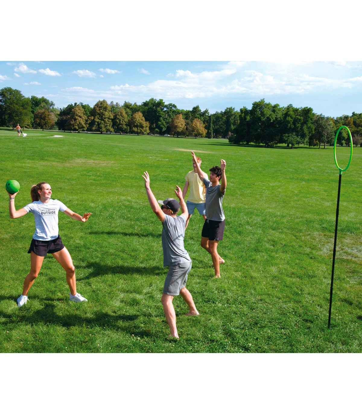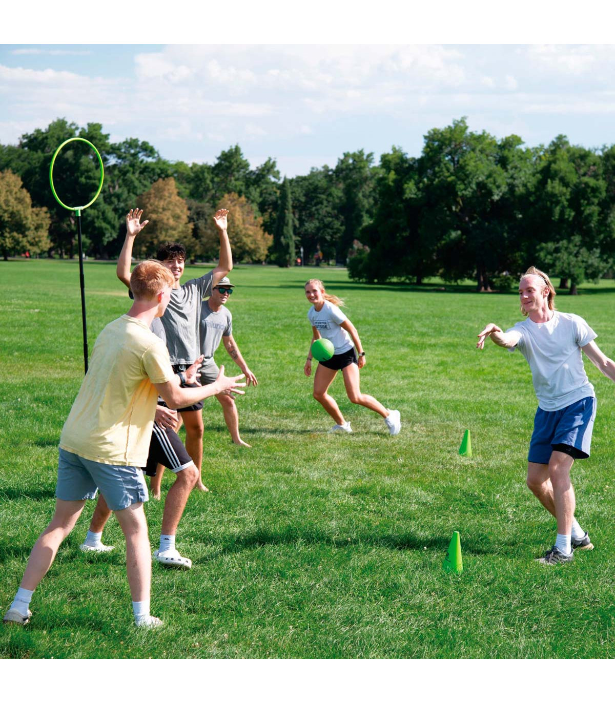 Bamzball es perfecto para la playa o el parque. Ideal para jugar entre amigos, grupos, fiestas, reuniones, escuelas y eventos al aire libre. Incluye poste de altura ajustable, aro, ancla, 2 balones inflables, 4 conos, un inflador y reglas del juego.