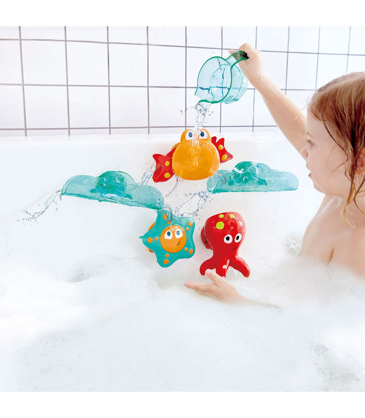 Convierte la pared de tu baño en olas oceánicas con este juego. El agua que corre hace que los animales marinos bailen y giren.