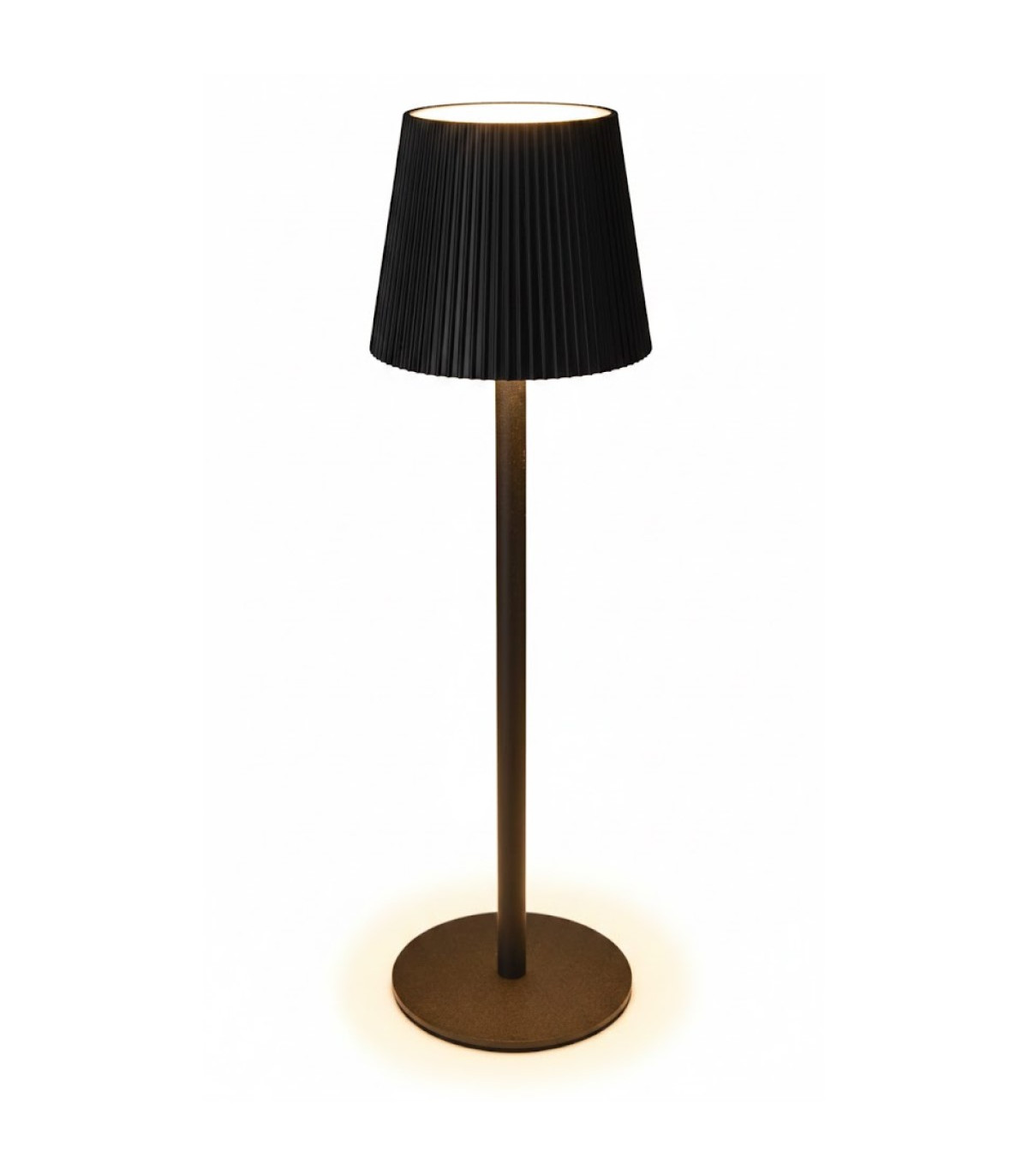 Una lámpara de mesa metálica de luz LED blanca cálida de 36 cm de alto y 10 cm de diámetro a batería recargable con cable USB, incluido, y con 4 intensidades de brillo regulable.