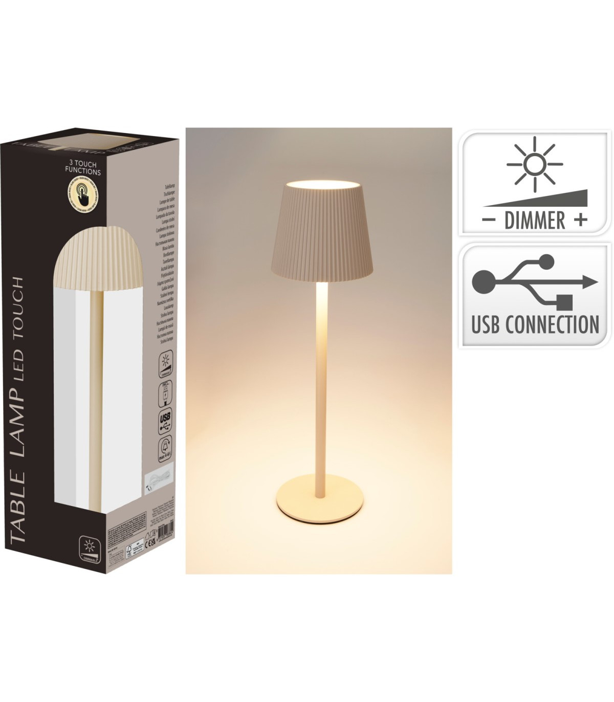 Una lámpara de mesa metálica de luz LED blanca cálida de 36 cm de alto y 10 cm de diámetro a batería recargable con cable USB, incluido, y 4 intensidades de brillo regulable.