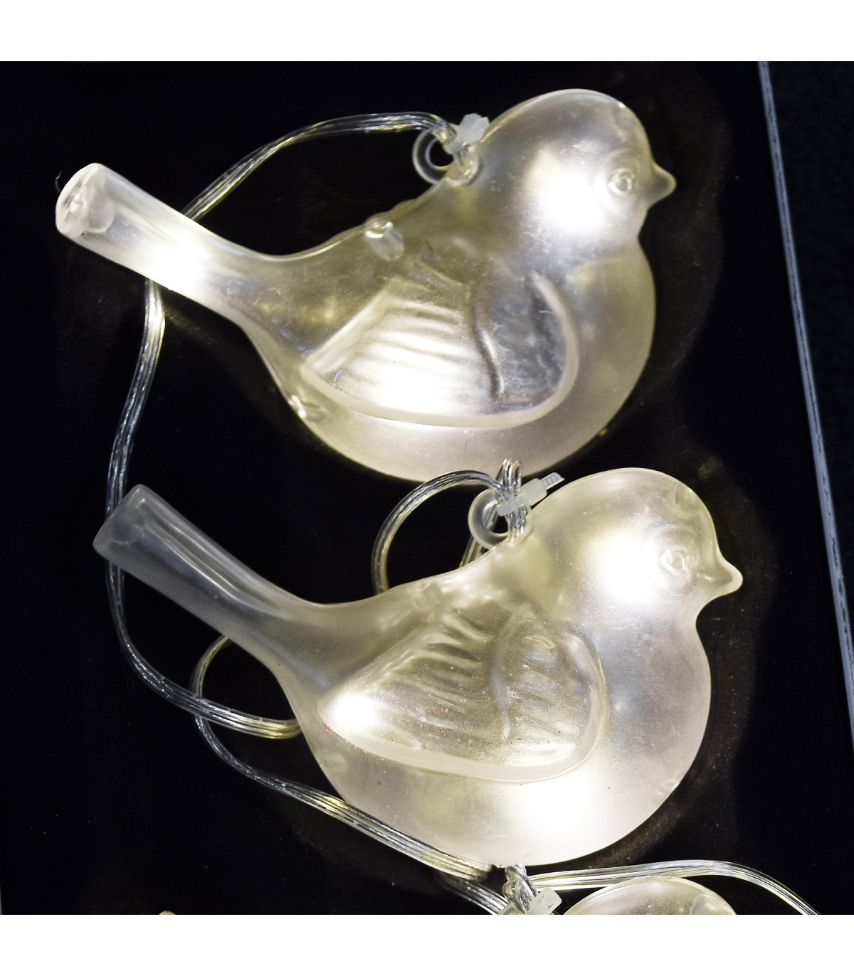 Tira de luces LED con 3 figuras plásticas de pajaros transparentes y 1,4 m de cable transparente. Funciona con 3 pilas AA, no incluidas, que permite ubicar las luces en cualquier lugar sin depender de un enchufe.
