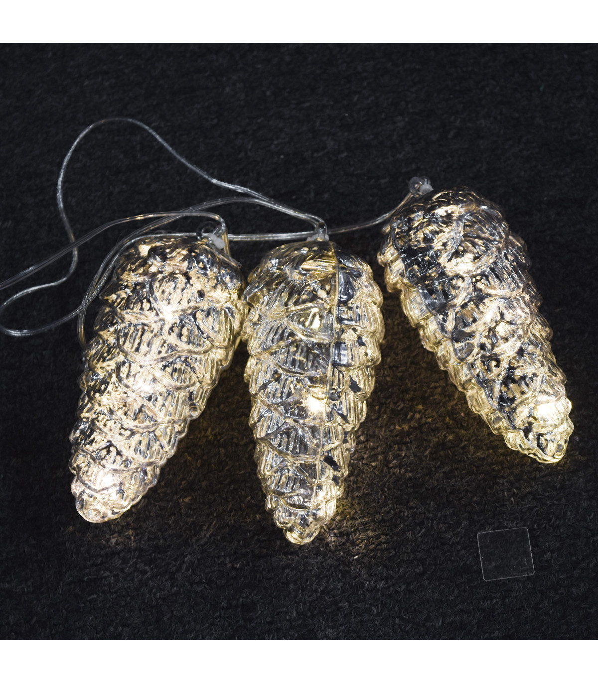 Tira de luces LED con 3 figuras plásticas de piñas color mercurio y 1,4 m de cable transparente. Funciona con 3 pilas AA, no incluidas, que te permite ubicar las luces en cualquier lugar sin depender de un enchufe.