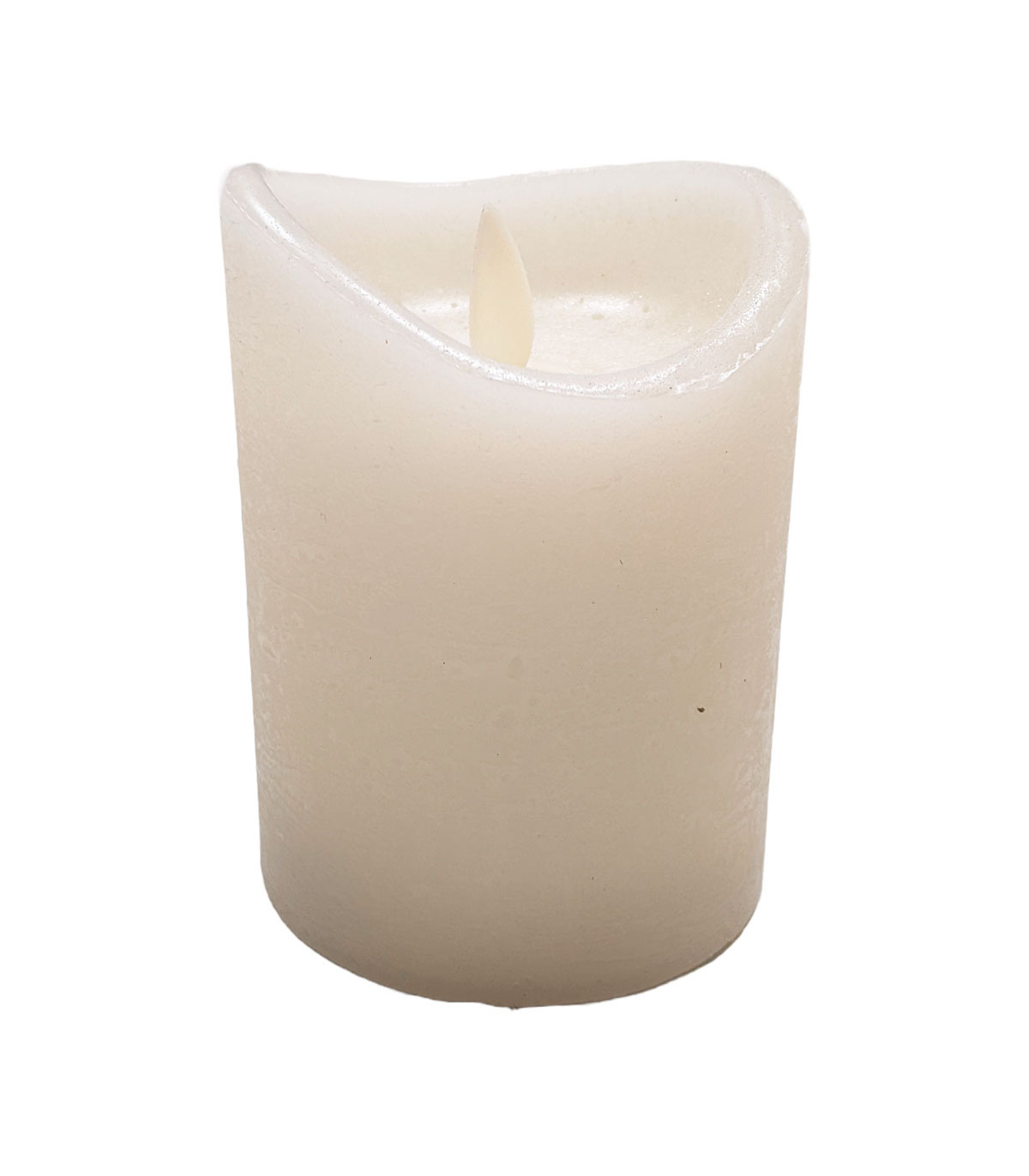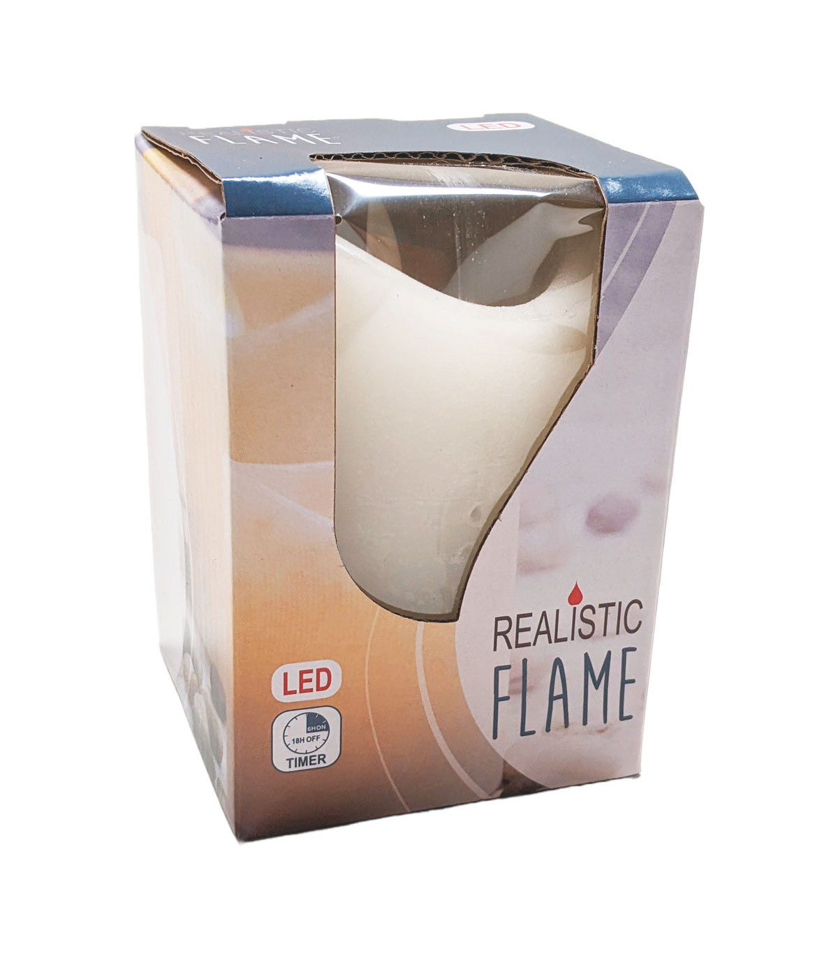 Una vela de cera con llama realista de LED a pila con efecto de flameo y función de temporizador para apagado automático.