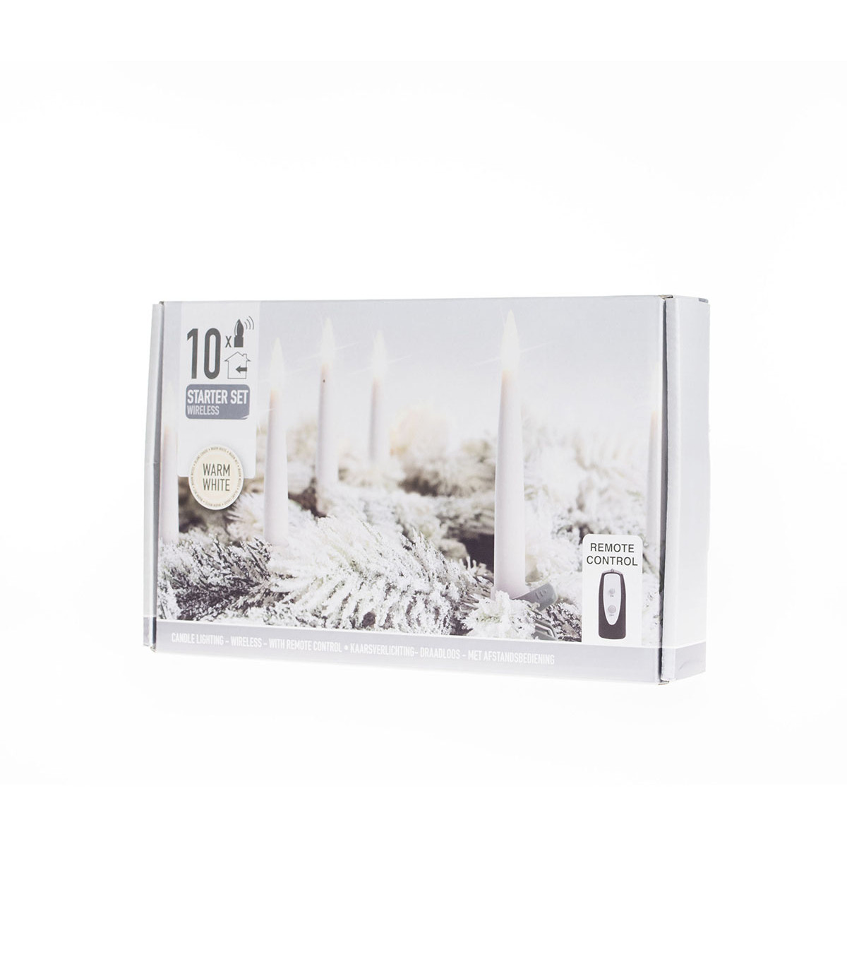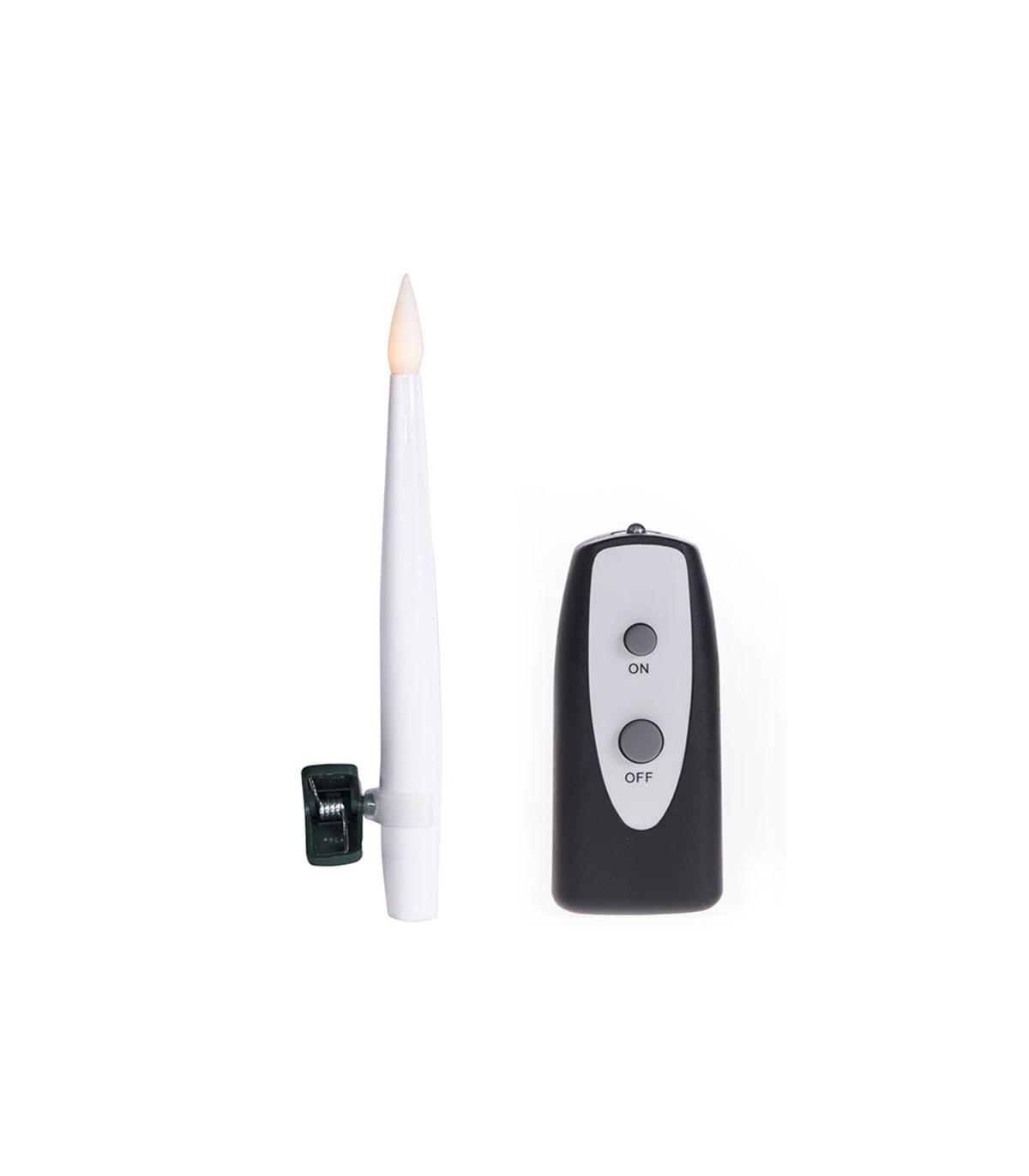 Set de 10 velas de luz LED cálidas e inalámbricas, color blanco con clip verde. Cada vela lleva 1 pila AAA, no incluida. Se operan con un control remoto que viene incluído.