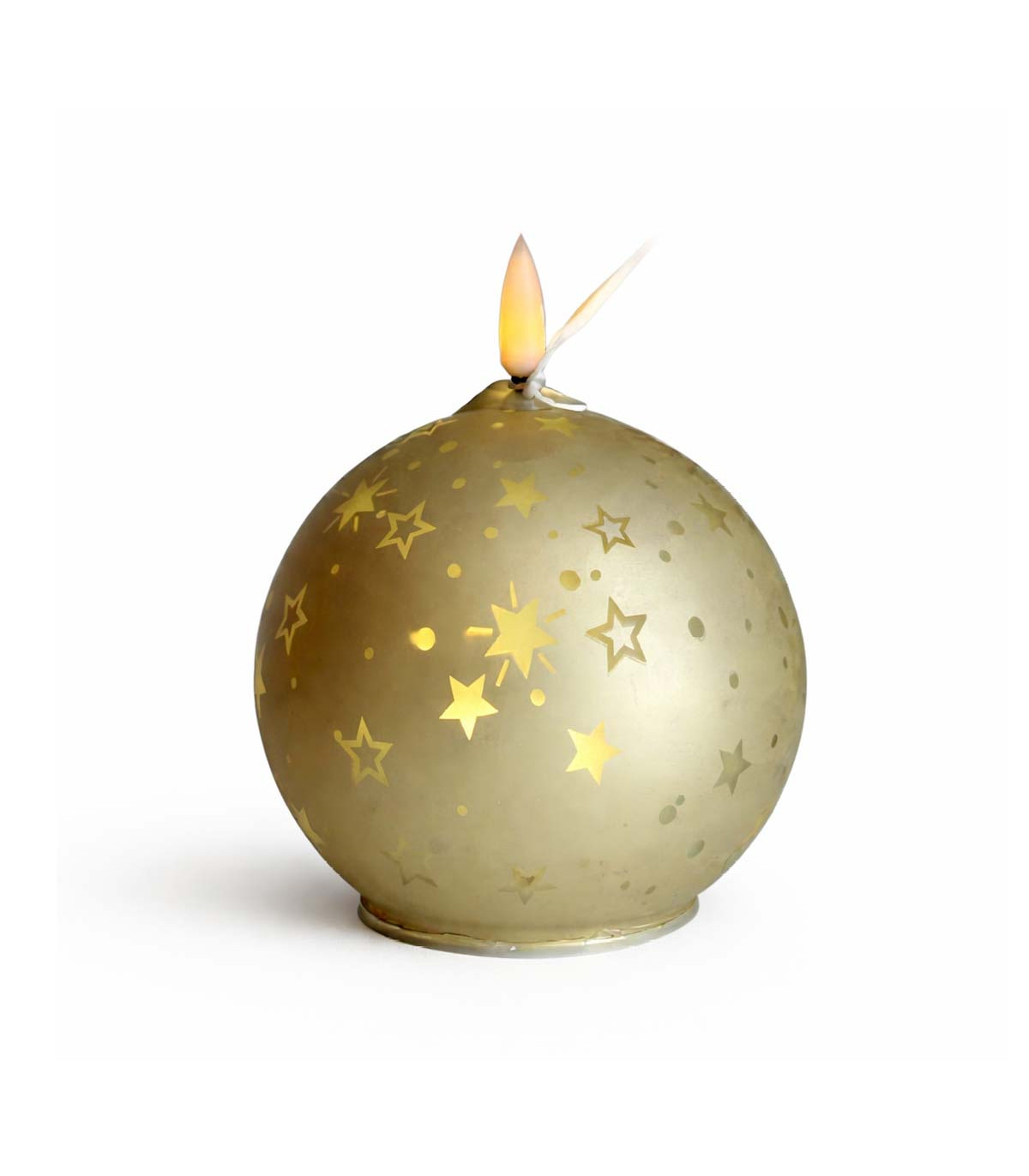 Una vela de luz LED blanca cálida en una esfera de vidrio con estrellas caladas de 10 cm de diámetro y 12 cm de alto. La llama titila con un efecto realista. Usa 3 pilas AAA no incluidas. Con switch ON-OFF en la parte inferior.
