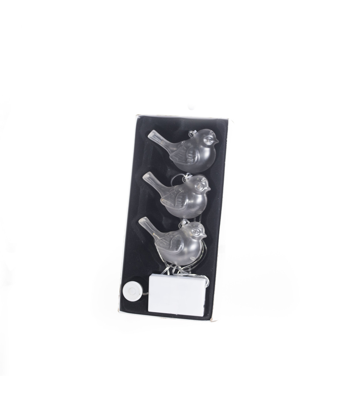 Tira de luces LED con 3 figuras plásticas de pajaros transparentes y 1,4 m de cable transparente. Funciona con 3 pilas AA, no incluidas, que permite ubicar las luces en cualquier lugar sin depender de un enchufe.