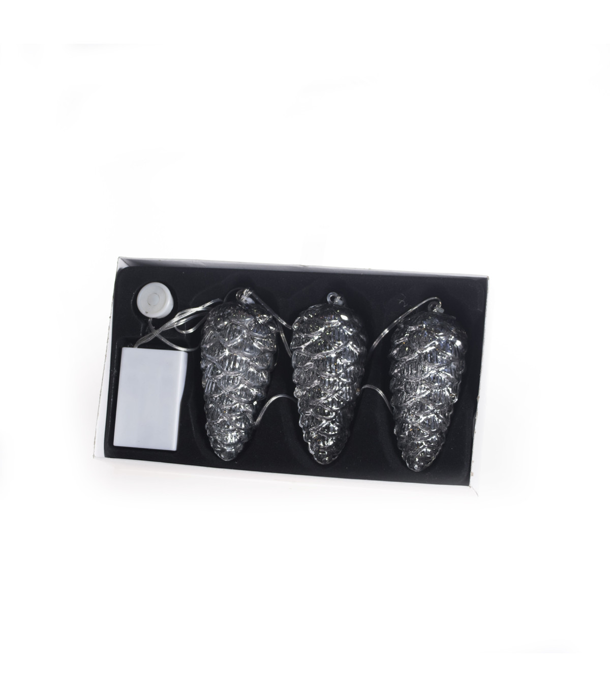 Tira de luces LED con 3 figuras plásticas de piñas color mercurio y 1,4 m de cable transparente. Funciona con 3 pilas AA, no incluidas, que te permite ubicar las luces en cualquier lugar sin depender de un enchufe.