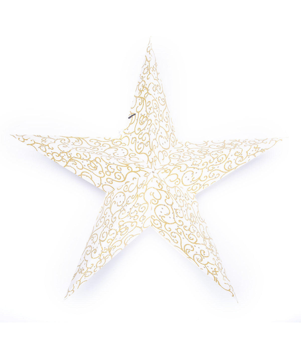 Una estrella luminosa blanca de papel con estampado de glitter dorado, de 60 cm de alto, para colgar. Contiene luces LED cálidas y cordón para colgar. Funciona con 2 pilas AA, no inlcuidas.