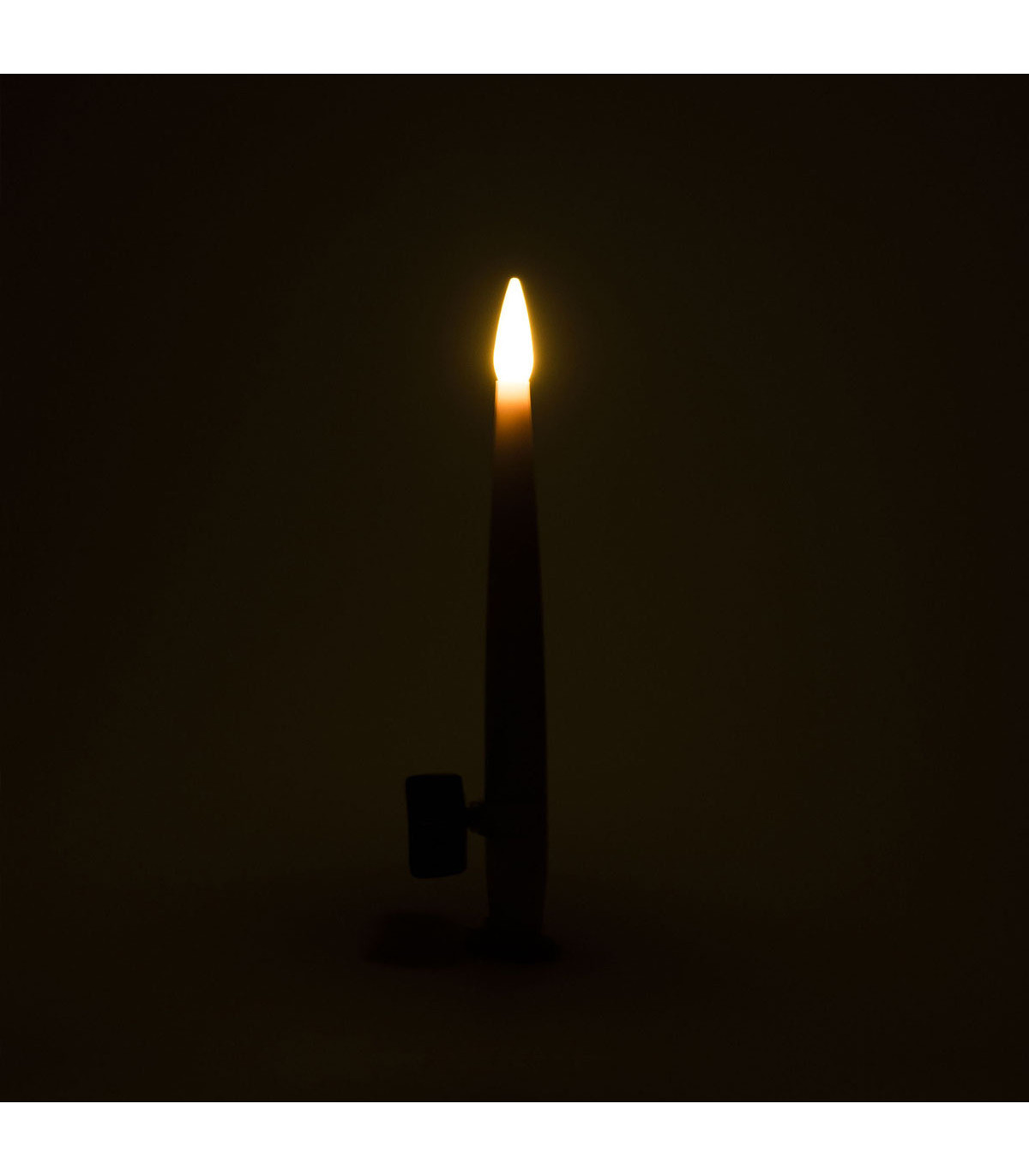 Una vela cónica de luz LED blanca cálida de 17.5 cm de alto y 5.8 cm de diámetro en la base. La llama titila con un efecto realista. Usa 2 pilas AA no incluidas. Con switch ON-OFF.