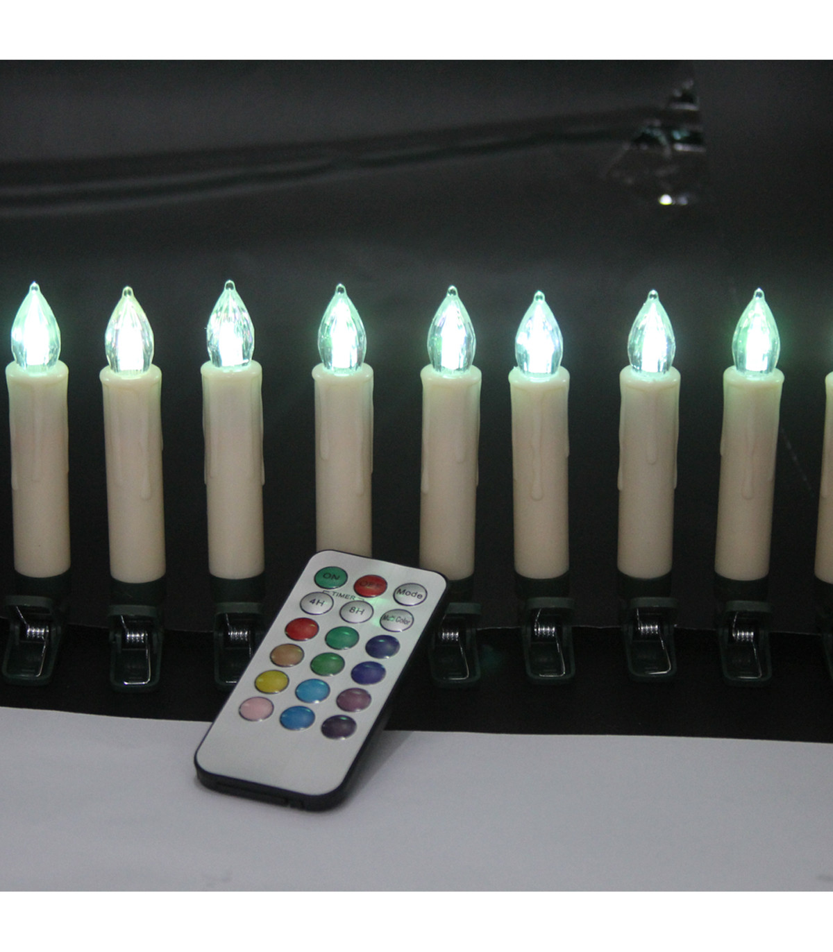 Un set de 10 velas con luz LED a control remoto. Cada vela lleva 1 pila, incluye control remoto. Tiene diferentes funciones en distintos colores, multicolor y con la función de que vaya cambiando solo de color. Ideal para decorar en Navidad.