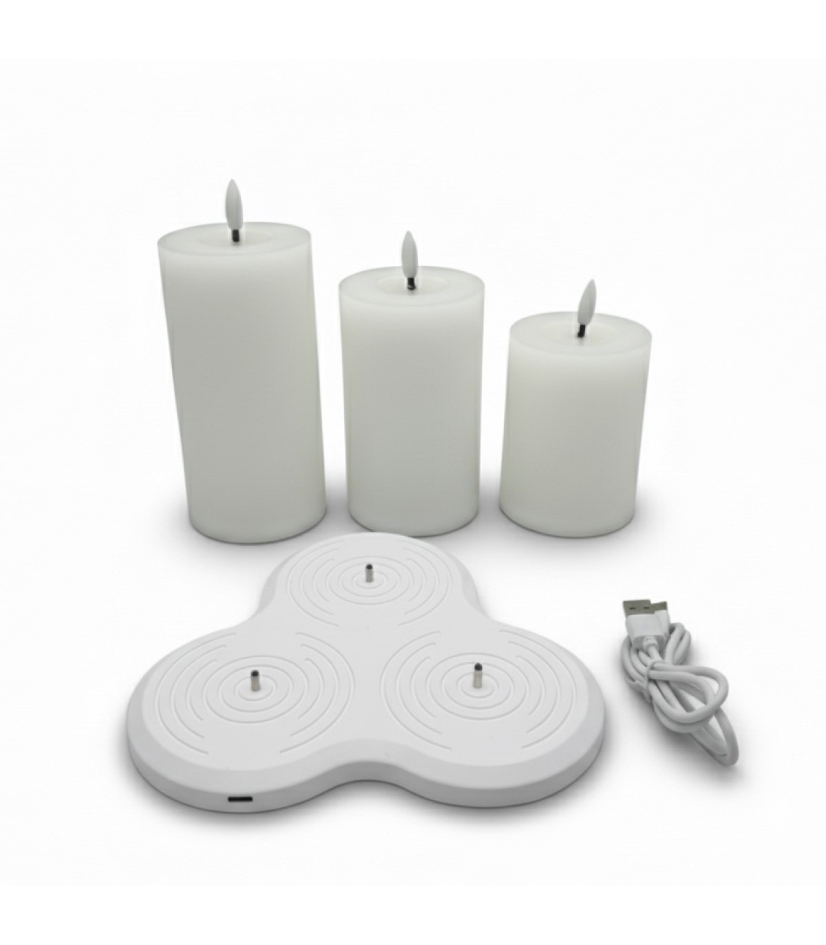Set de 3 velas pilar, 10 cm, 12.5 cm y 15 cm de alto, con luz LED blanca cálida con base de recarga y cable USB. La llama titila con efecto realista. Batería 120 mAh Li-Poly, input 1A 5V, con cable USB 1A 0.8m. Luz indicadora de carga y switch on-off.