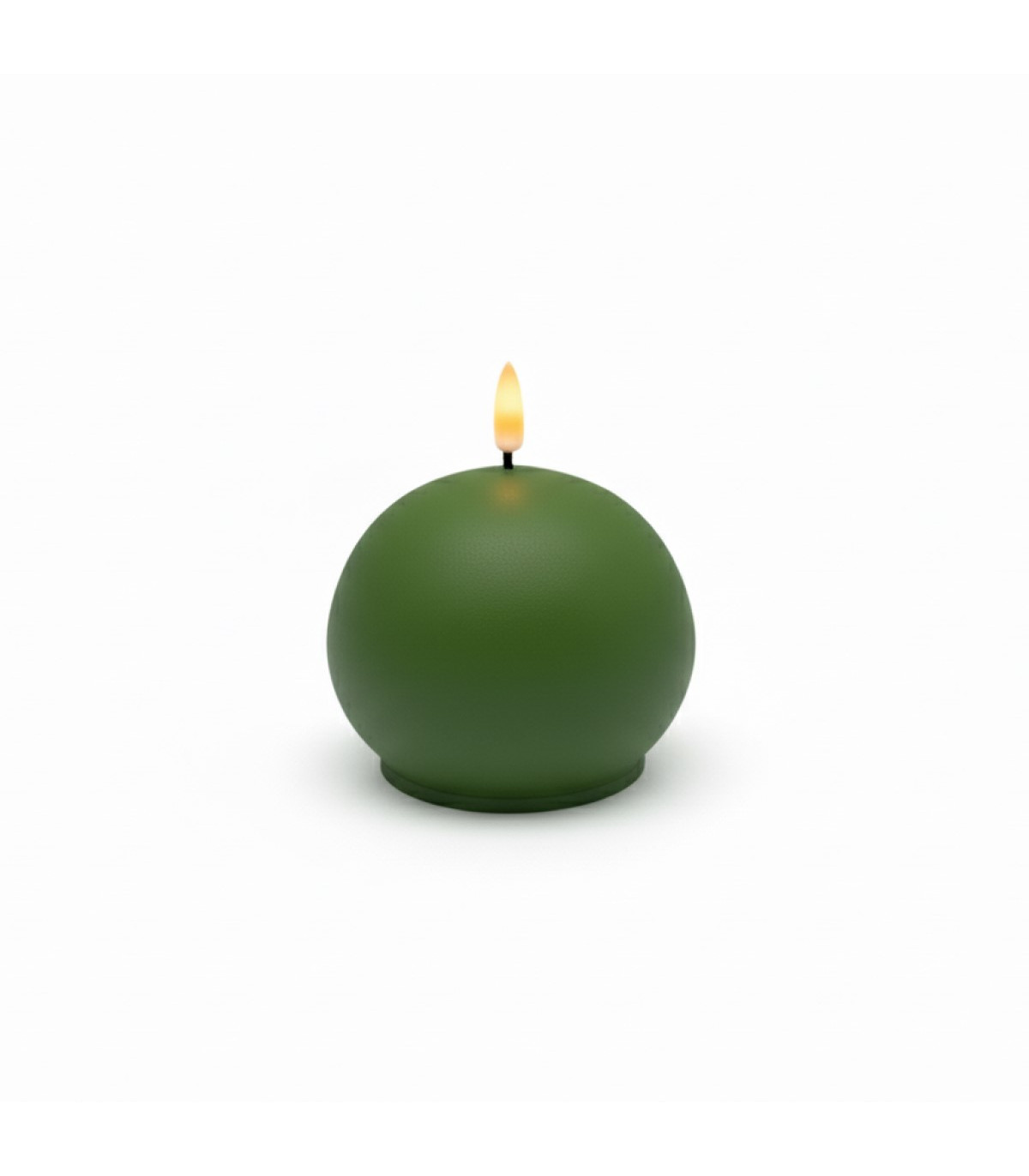 Una vela esférica de luz LED blanca cálida de 10 cm de diámetro. La llama titila con un efecto realista. Usa 2 pilas AA no incluidas. Con switch ON-OFF.