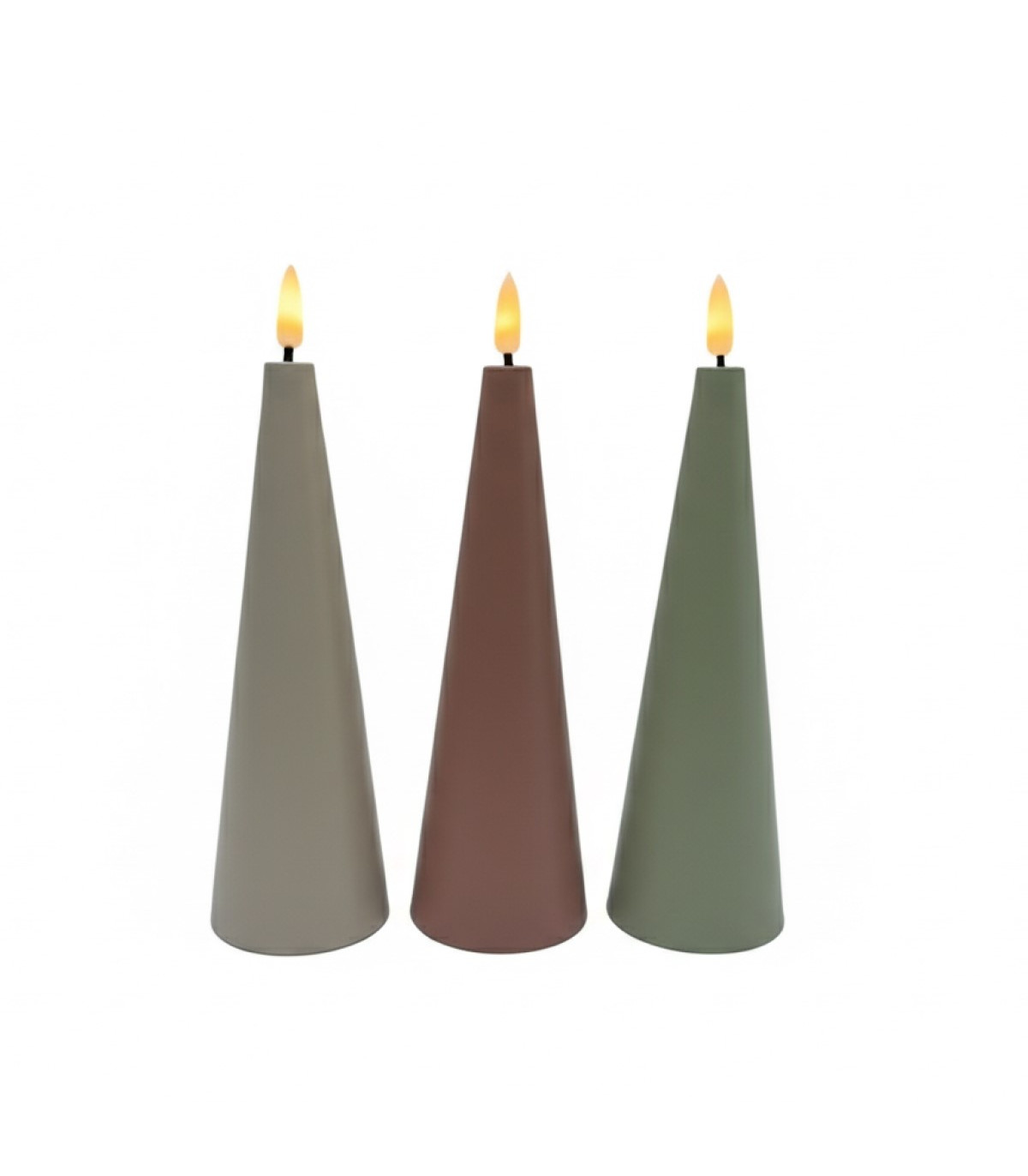 Una vela cónica de luz LED blanca cálida de 17.5 cm de alto y 5.8 cm de diámetro en la base. La llama titila con un efecto realista. Usa 2 pilas AA no incluidas. Con switch ON-OFF.