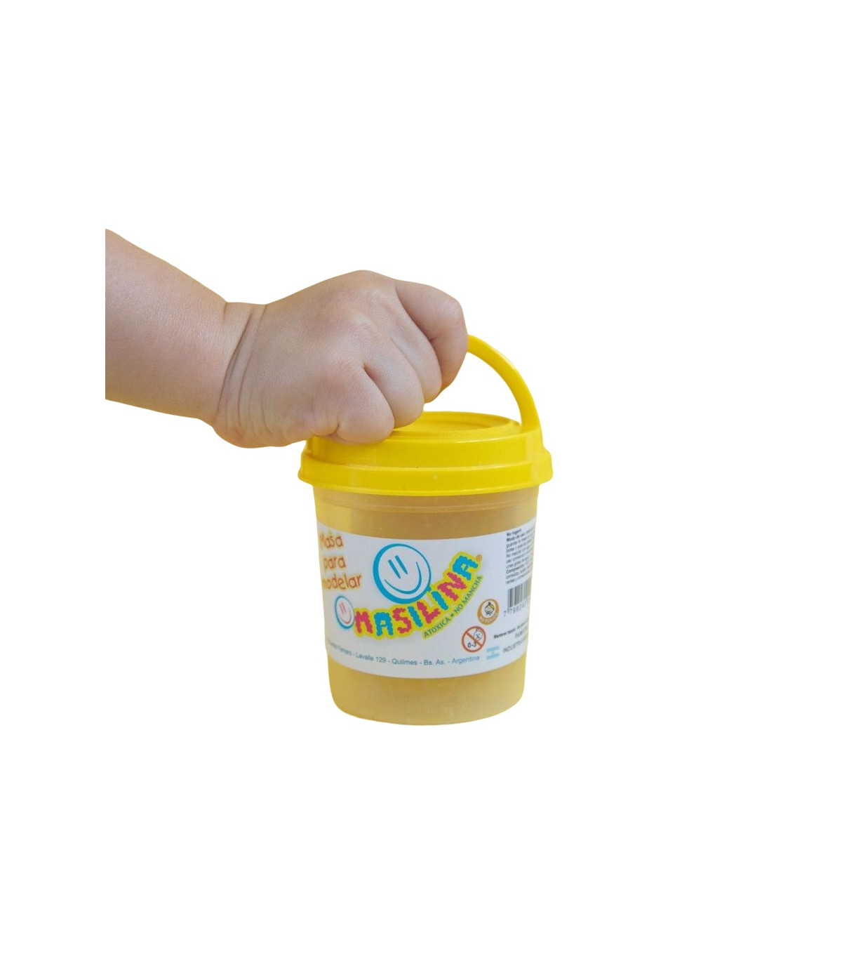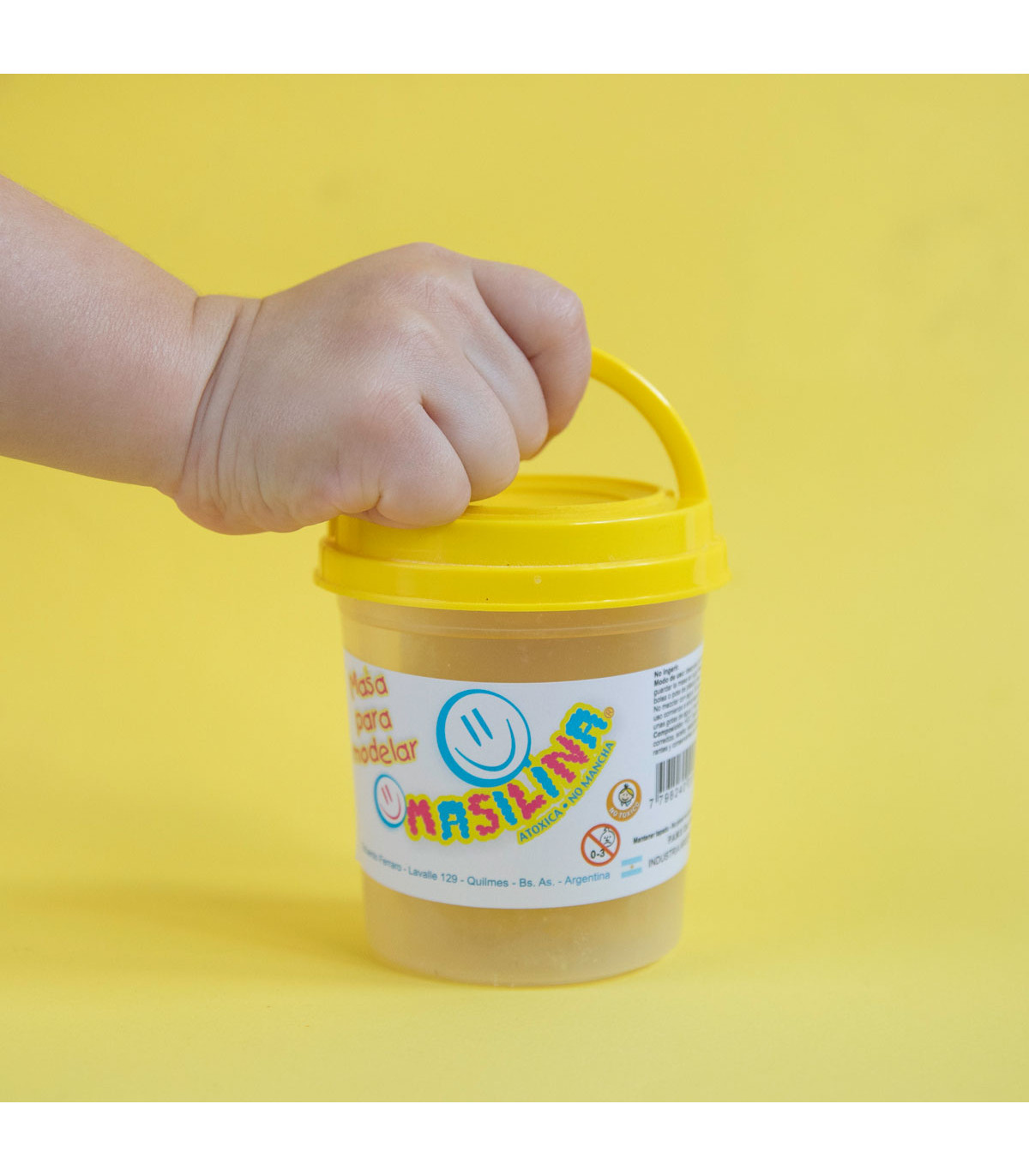 Un pote de plástico con una tapa para crear un emoji bajorrelieve y 150 g de masa amarilla para moldear Masilina.