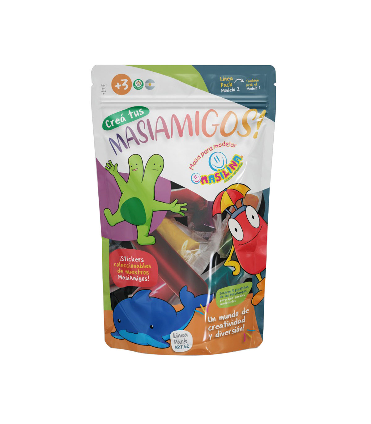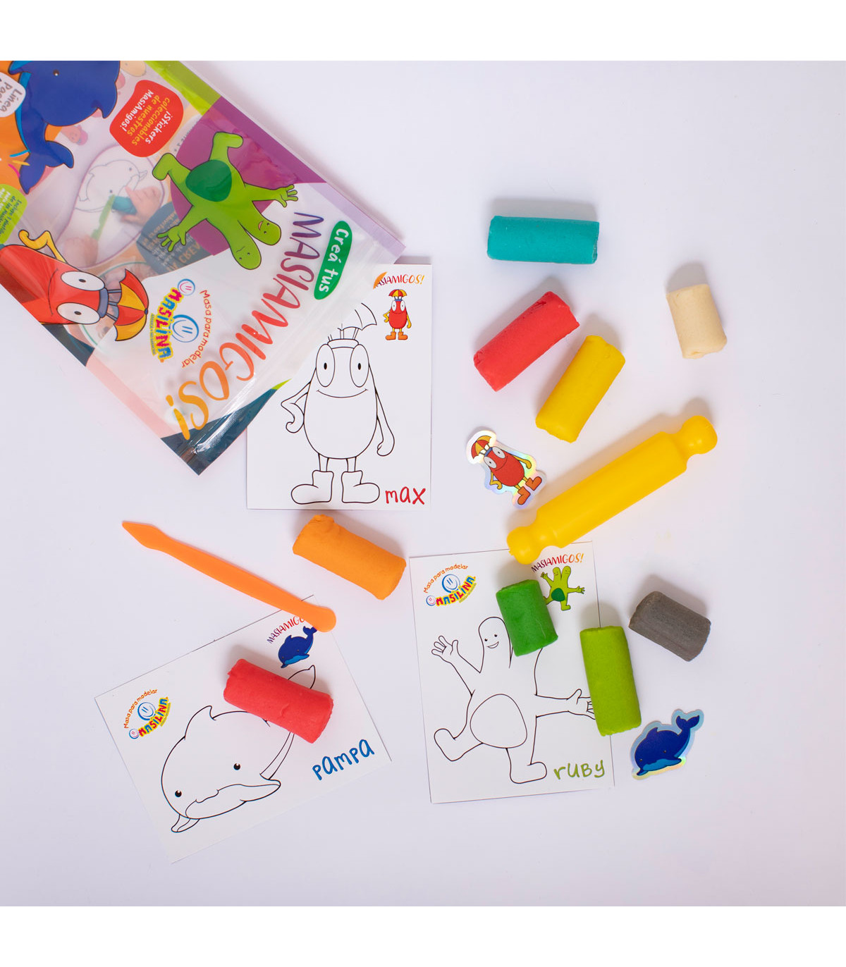 Un pack de Masilina con cierre zip con 10 barras de masas para moldear de distintos colores, 3 plantillas de Masiamigos plastificadas, 1 palito de amasar, 1 esteca y 2 stickers. Masas elásticas, no tóxicas y que no manchan.