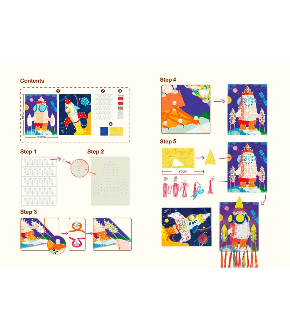Un kit de manualidades con cuerdas con 2 hojas de arte con cuerdas, clavijas de plástico, cuerda de colores y piezas decorativas para hacer una hermosa obra de arte. Edad: a partir de los 5 años.