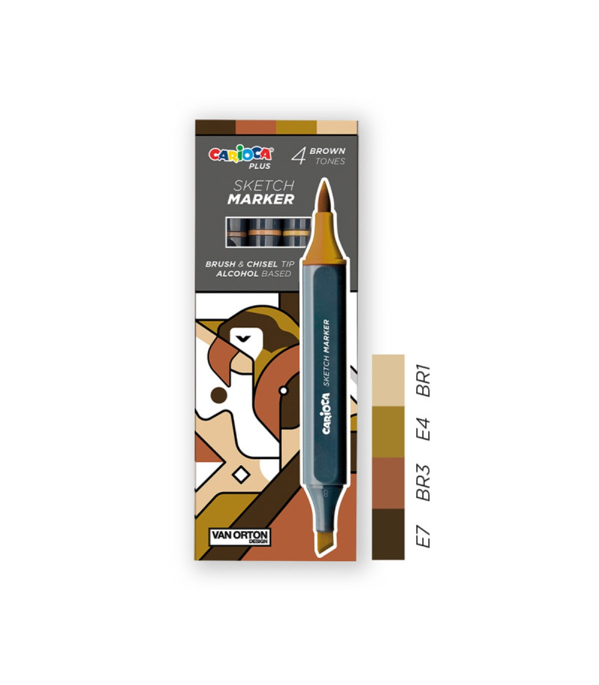 Una caja de 4 marcadores de doble punta con tinta a base de alcohol de secado rápido, una biselada y otra de pincel suave. Su forma ergonómica garantiza un agarre cómodo.