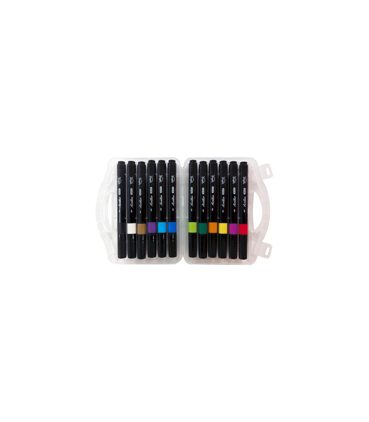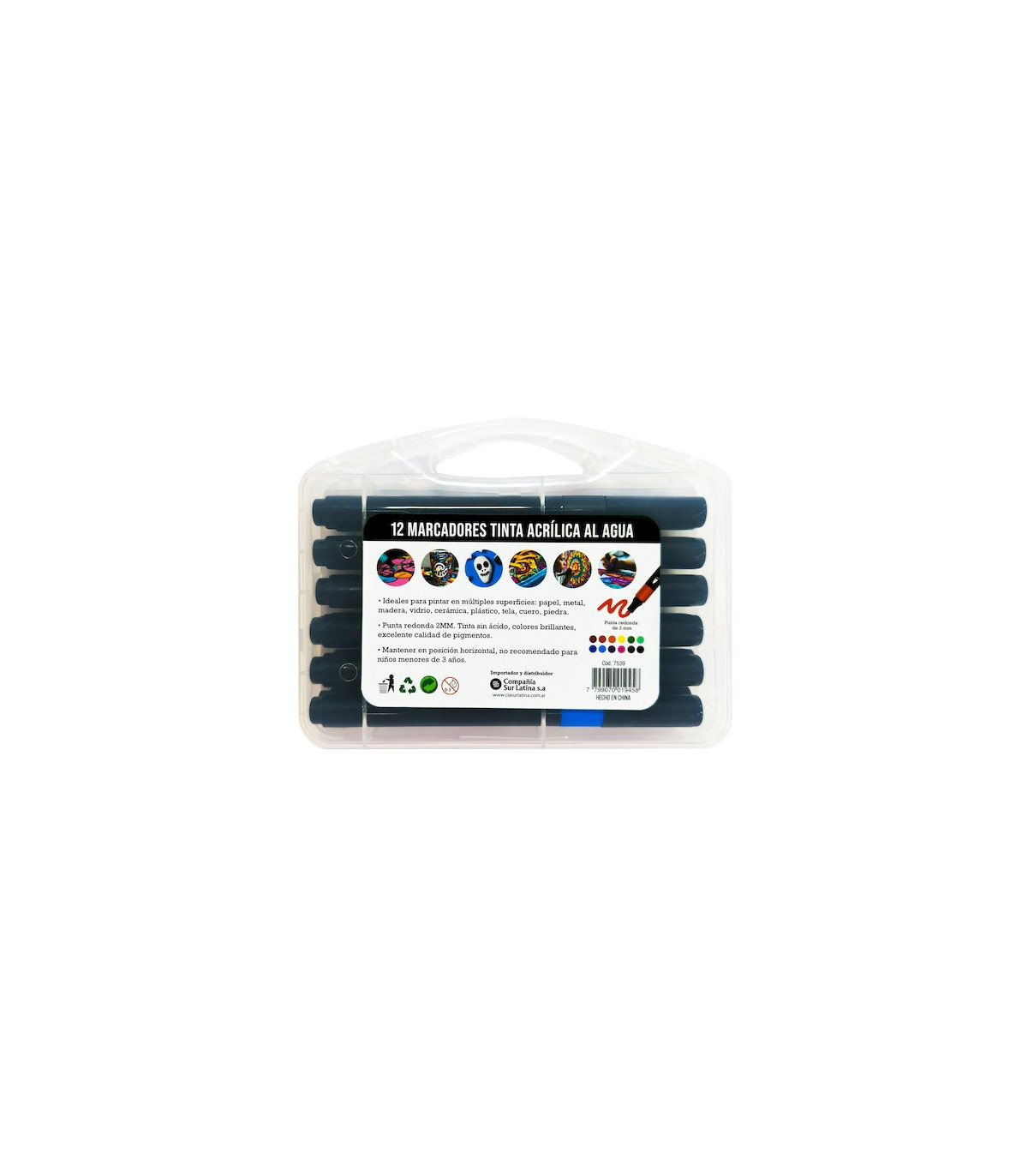 Una valija plástica con 12 marcadores acrílicos de colores Talbot de punta redonda de 2 mm perfecta para los detalles. Tinta pigmentada libre de ácido. Apto para papel, metal, madera, vidrio, cerámico, plástico, tela, piedra, etc.