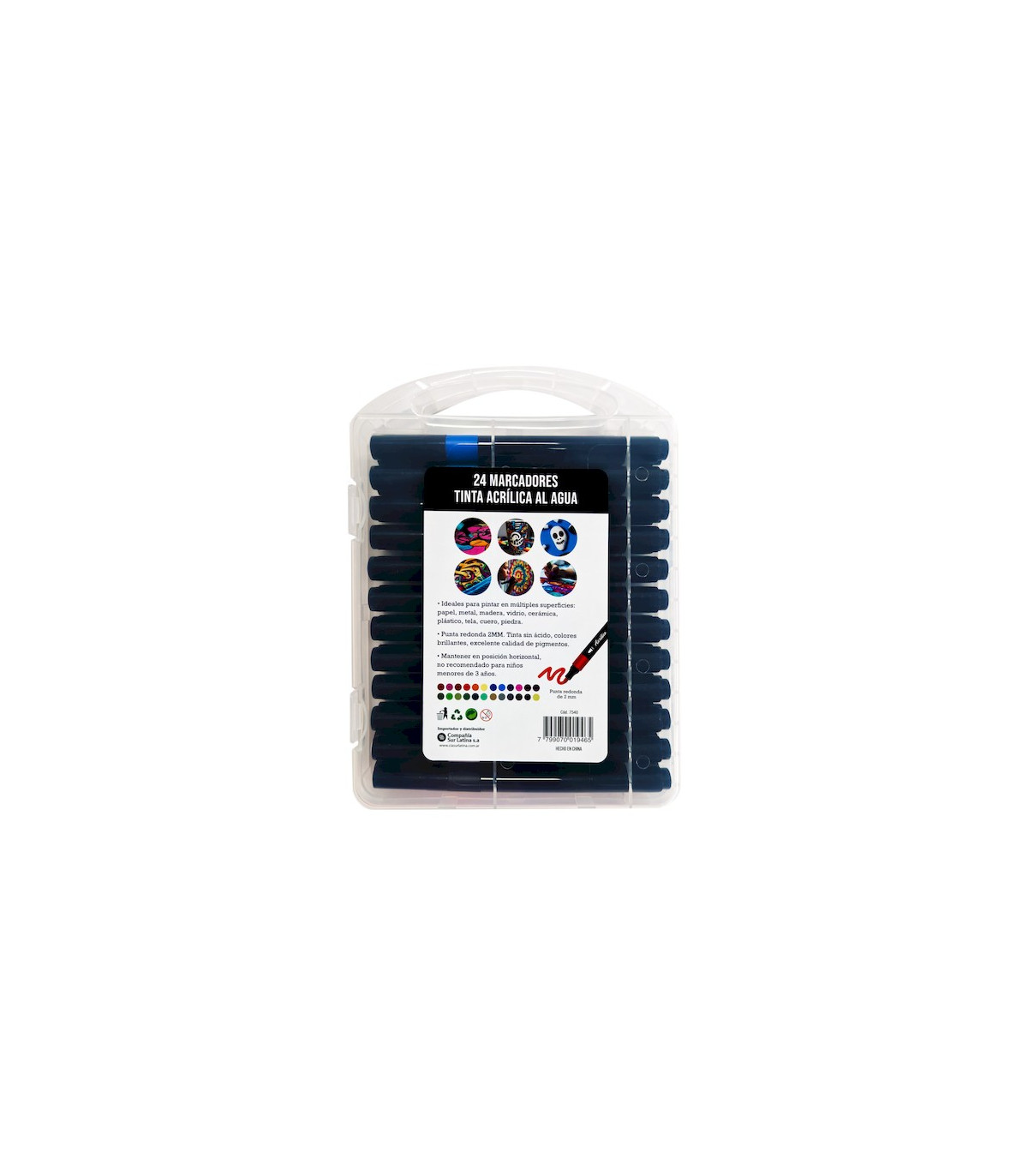 Una valija plástica con 24 marcadores acrílicos de colores Talbot de punta redonda de 2 mm perfecta para los detalles. Tinta pigmentada libre de ácido. Apto para papel, metal, madera, vidrio, cerámico, plástico, tela, piedra, etc.