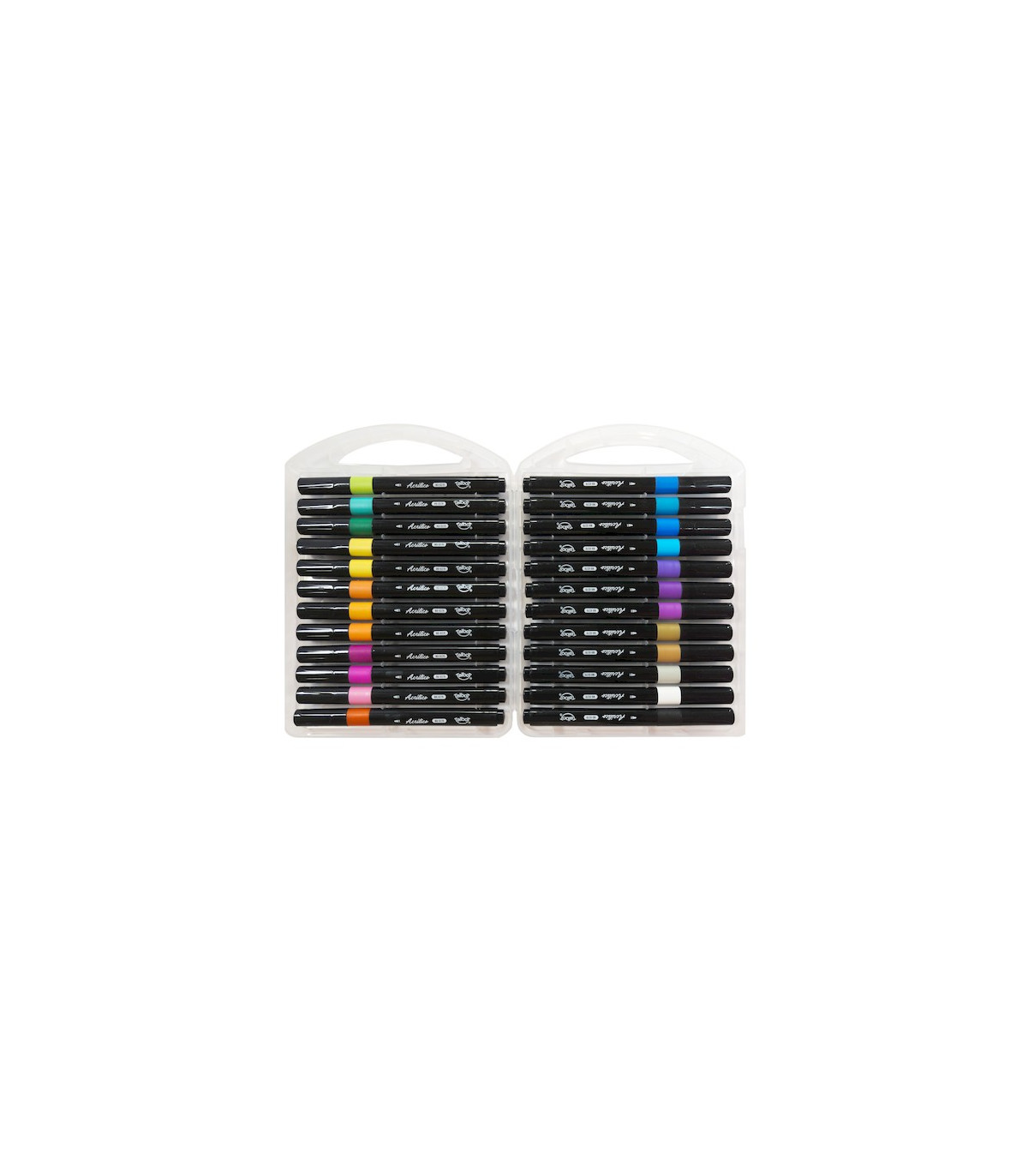Una caja con 24 marcadores de colores de punta de fibra de calidad superior. La punta cónica permite un trazo doble, fino y grueso, en un solo marcador. Tinta súper intensa y resistente a la luz.