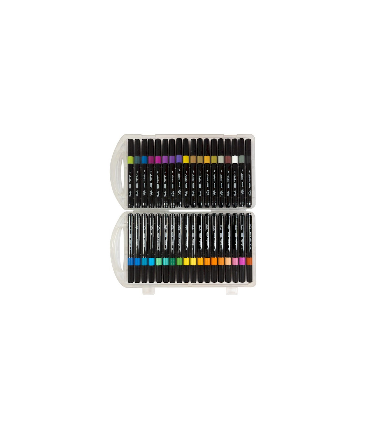 Una valija plástica con 48 marcadores acrílicos de colores Talbot de punta redonda de 2 mm perfecta para los detalles. Tinta pigmentada libre de ácido. Apto para papel, metal, madera, vidrio, cerámico, plástico, tela, piedra, etc.