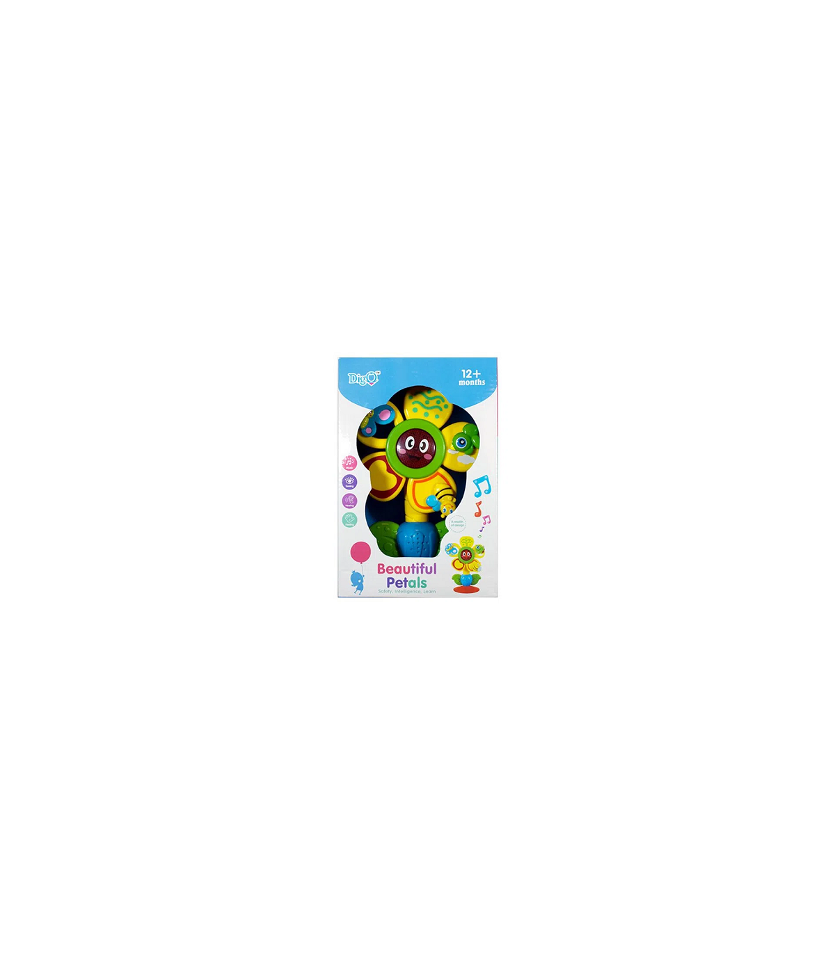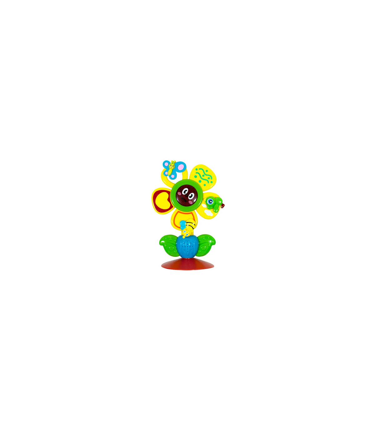 Una flor de plastico de juguete con luz y movimiento de 21,5 x 14,5 cm. Utiliza 2 pilas AA, no incluidas.