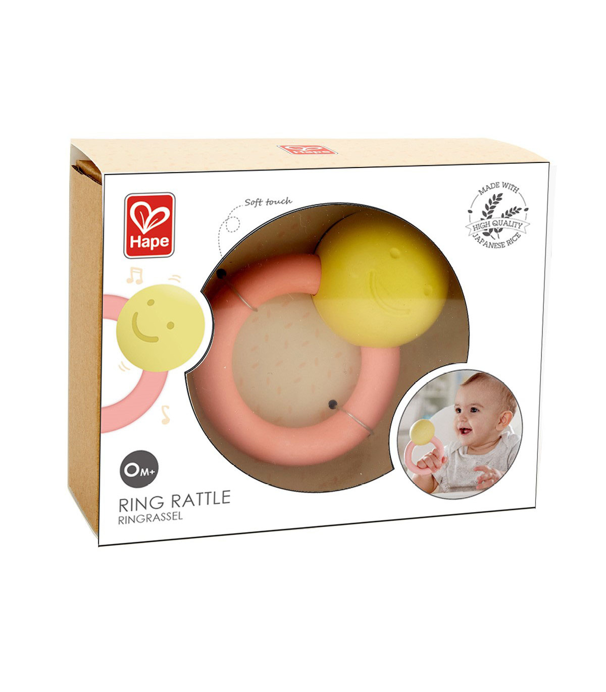 Fabricado con materiales seguros a base de arroz, este sonajero tiene una cara feliz acoplada en un aro. Fácil de agarrar y sostener.