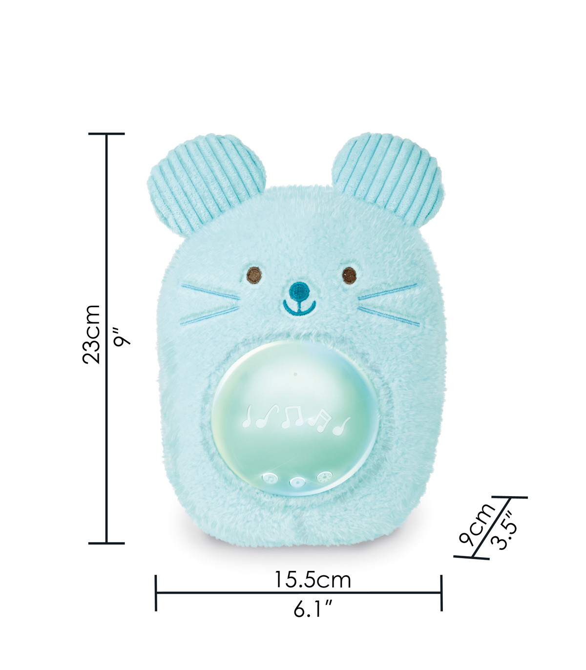 Una luz de cuna de peluche con forma de ratón. Con luz suave, efectos de sonido naturales y canciones de cuna relajantes para que los peques se duerman plácidamente. Incluso podés grabar 120 segundos de tu propia voz.