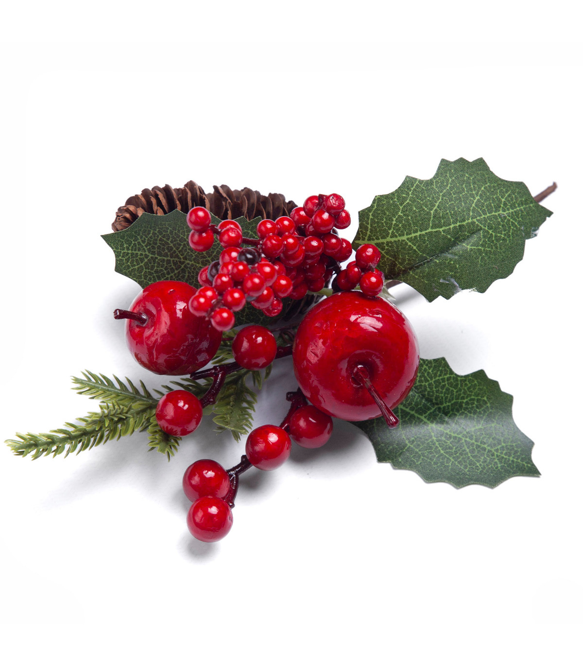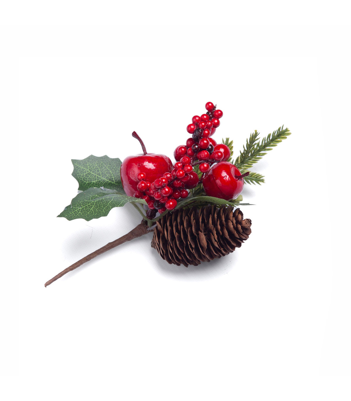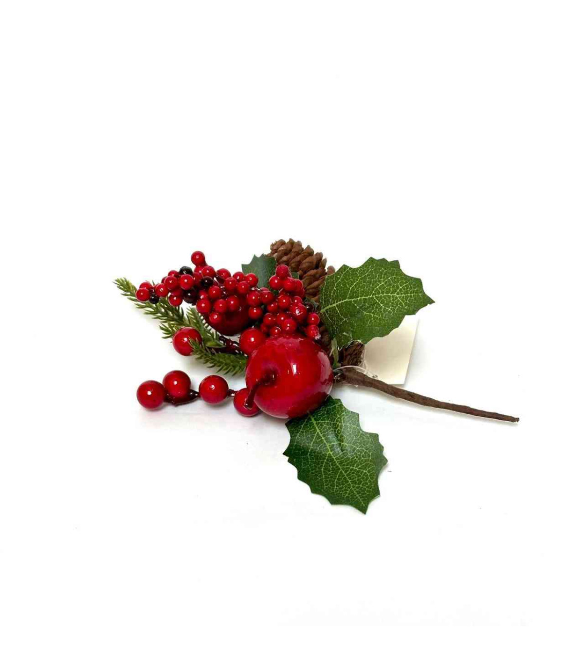 Un adorno con forma de pick con manzana y frutos de 20 cm de alto hecho en poliéster,goma espuma,plástico, alambre y piñas para decorar el árbol de Navidad