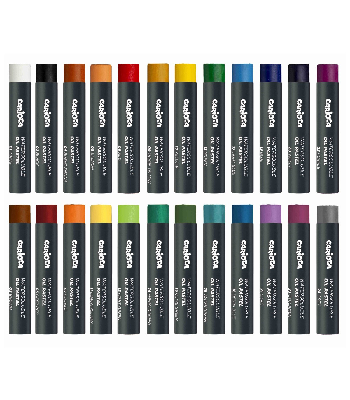 Una caja con 24 pasteles al óleo de trazo súper suave y colores brillantes y opacos. Solubles en agua.