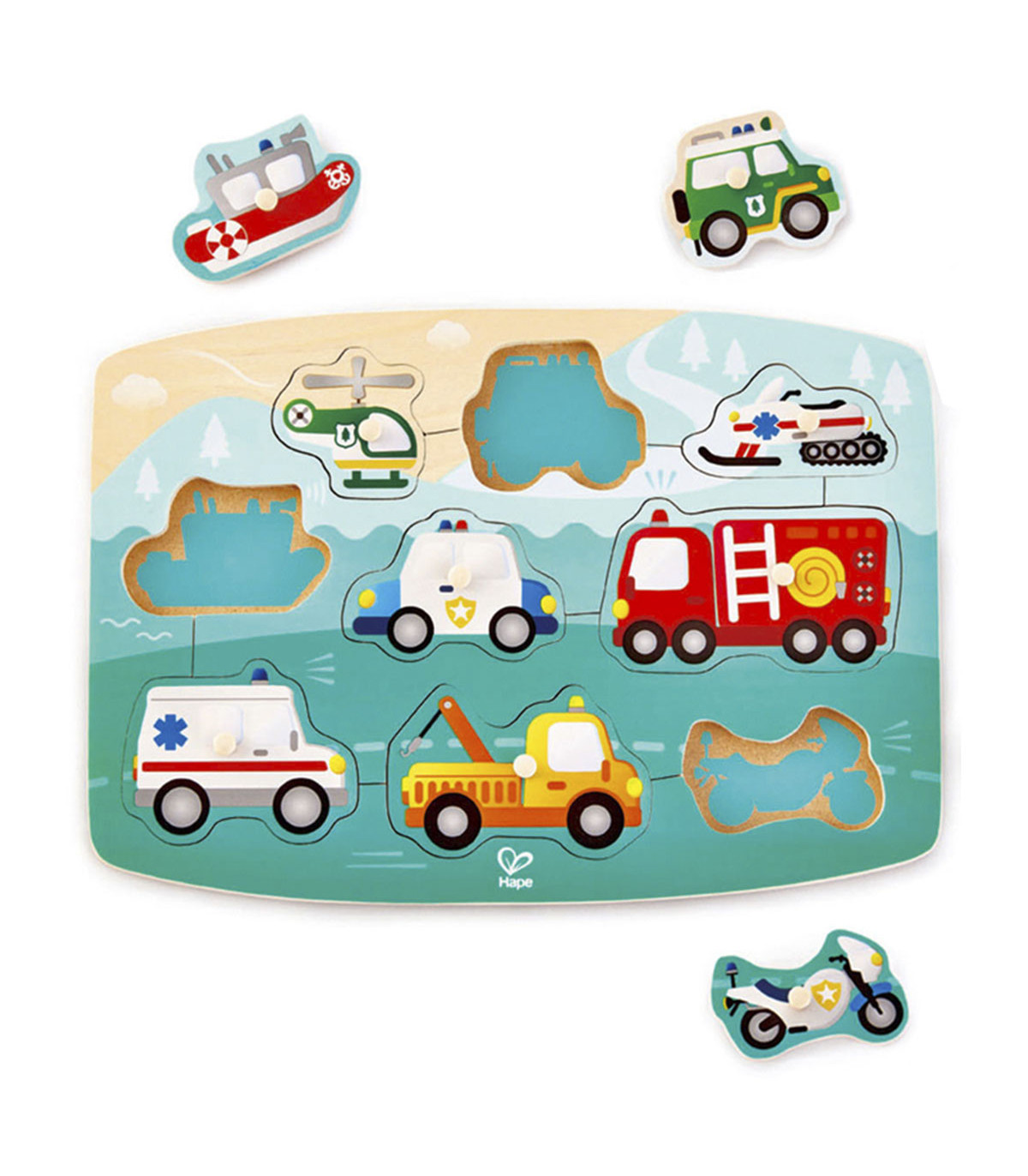 Un colorido puzzle de madera con vehículos de emergencias para estimular la motricidad fina de los más chiquitos.
