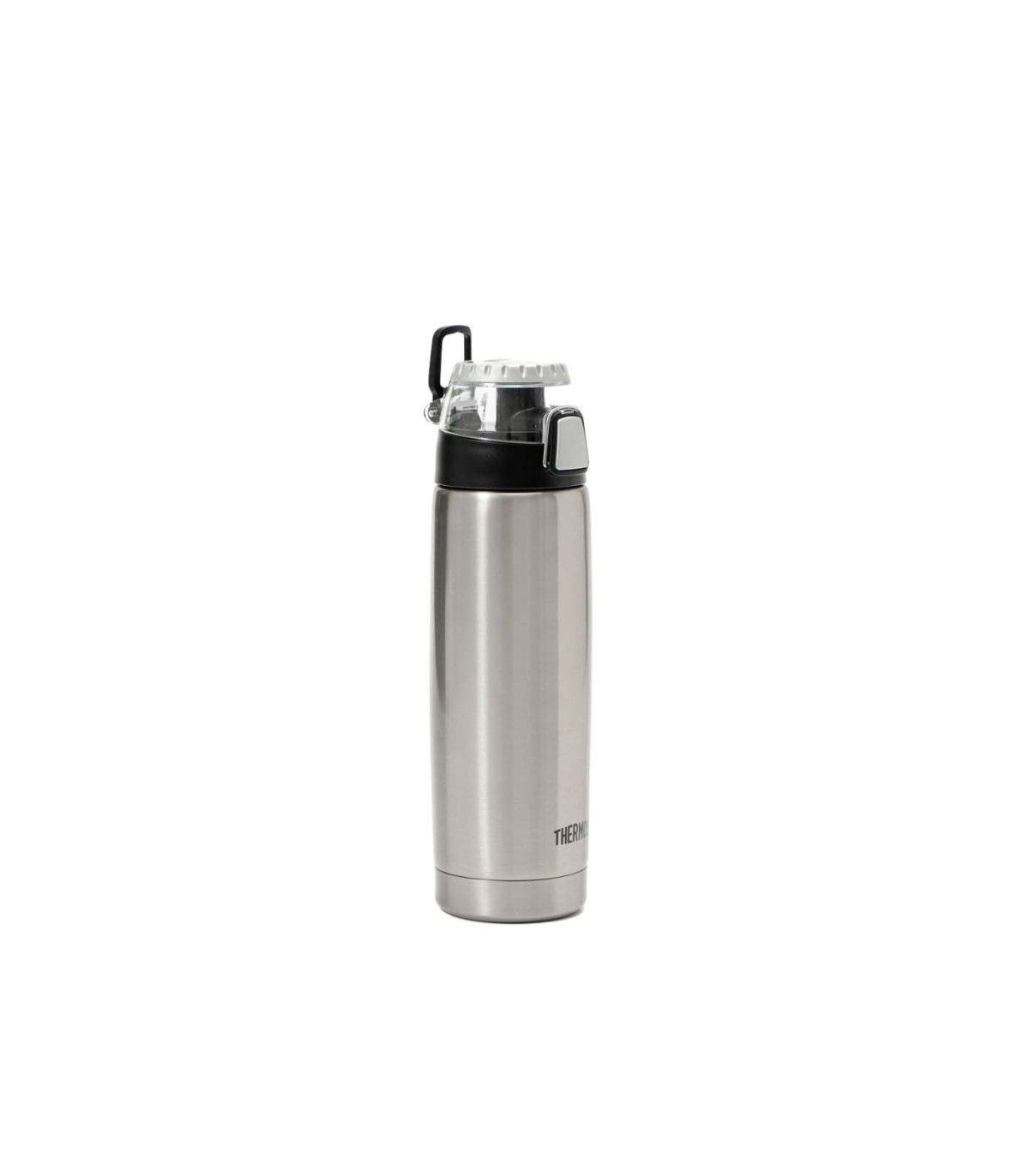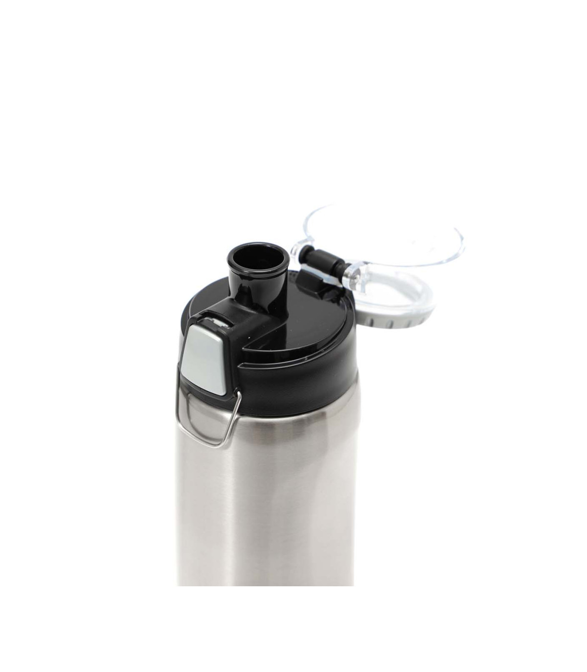 Una botella térmica de acero inoxidable con tecnología de aislamiento al vacío que mantiene la bebida fría por 14 hs. La tapa de botón con anillo de bloqueo evita derrames. Boquilla de flujo rápido y funda de silicona fácil de agarrar.